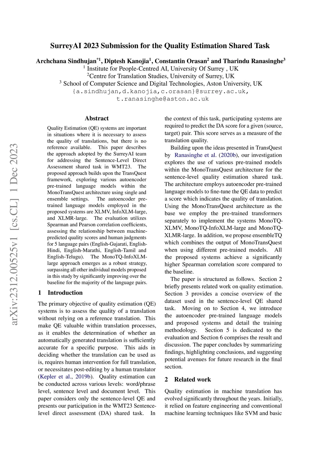 Quality Estimation (QE) systems are important in situations where it is necessary to assess the quality of translations, but there is no reference available. This paper describes the approach adopted by the SurreyAI team for addressing the Sentence-Level Direct Assessment shared task in WMT23. The proposed approach builds upon the TransQuest framework, exploring various autoencoder pre-trained language models within the MonoTransQuest architecture using single and ensemble settings. The autoencoder pre-trained language models employed in the proposed systems are XLMV, InfoXLM-large, and XLMR-large. The evaluation utilizes Spearman and Pearson correlation coefficients, assessing the relationship between machine-predicted quality scores and human judgments for 5 language pairs (English-Gujarati, English-Hindi, English-Marathi, English-Tamil and English-Telugu). The MonoTQ-InfoXLM-large approach emerges as a robust strategy, surpassing all other individual models proposed in this study by significantly improving over the baseline for the majority of the language pairs.