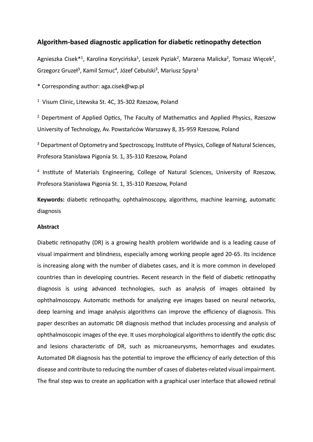 Diabetic retinopathy (DR) is a growing health problem worldwide and is a leading cause of visual impairment and blindness, especially among working people aged 20-65. Its incidence is increasing along with the number of diabetes cases, and it is more common in developed countries than in developing countries. Recent research in the field of diabetic retinopathy diagnosis is using advanced technologies, such as analysis of images obtained by ophthalmoscopy. Automatic methods for analyzing eye images based on neural networks, deep learning and image analysis algorithms can improve the efficiency of diagnosis. This paper describes an automatic DR diagnosis method that includes processing and analysis of ophthalmoscopic images of the eye. It uses morphological algorithms to identify the optic disc and lesions characteristic of DR, such as microaneurysms, hemorrhages and exudates. Automated DR diagnosis has the potential to improve the efficiency of early detection of this disease and contribute to reducing the number of cases of diabetes-related visual impairment. The final step was to create an application with a graphical user interface that allowed retinal images taken at cooperating ophthalmology offices to be uploaded to the server. These images were then analyzed using a developed algorithm to make a diagnosis.