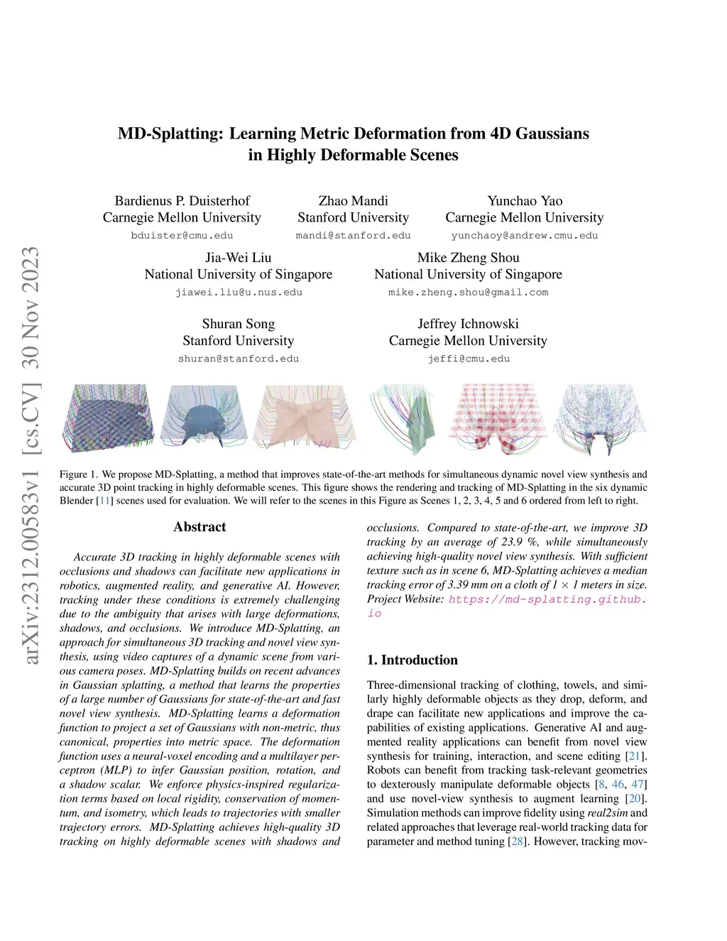 Accurate 3D tracking in highly deformable scenes with occlusions and shadows can facilitate new applications in robotics, augmented reality, and generative AI. However, tracking under these conditions is extremely challenging due to the ambiguity that arises with large deformations, shadows, and occlusions. We introduce MD-Splatting, an approach for simultaneous 3D tracking and novel view synthesis, using video captures of a dynamic scene from various camera poses. MD-Splatting builds on recent advances in Gaussian splatting, a method that learns the properties of a large number of Gaussians for state-of-the-art and fast novel view synthesis. MD-Splatting learns a deformation function to project a set of Gaussians with non-metric, thus canonical, properties into metric space. The deformation function uses a neural-voxel encoding and a multilayer perceptron (MLP) to infer Gaussian position, rotation, and a shadow scalar. We enforce physics-inspired regularization terms based on local rigidity, conservation of momentum, and isometry, which leads to trajectories with smaller trajectory errors. MD-Splatting achieves high-quality 3D tracking on highly deformable scenes with shadows and occlusions. Compared to state-of-the-art, we improve 3D tracking by an average of 23.9 %, while simultaneously achieving high-quality novel view synthesis. With sufficient texture such as in scene 6, MD-Splatting achieves a median tracking error of 3.39 mm on a cloth of 1 x 1 meters in size. Project website: https://md-splatting.github.io/.