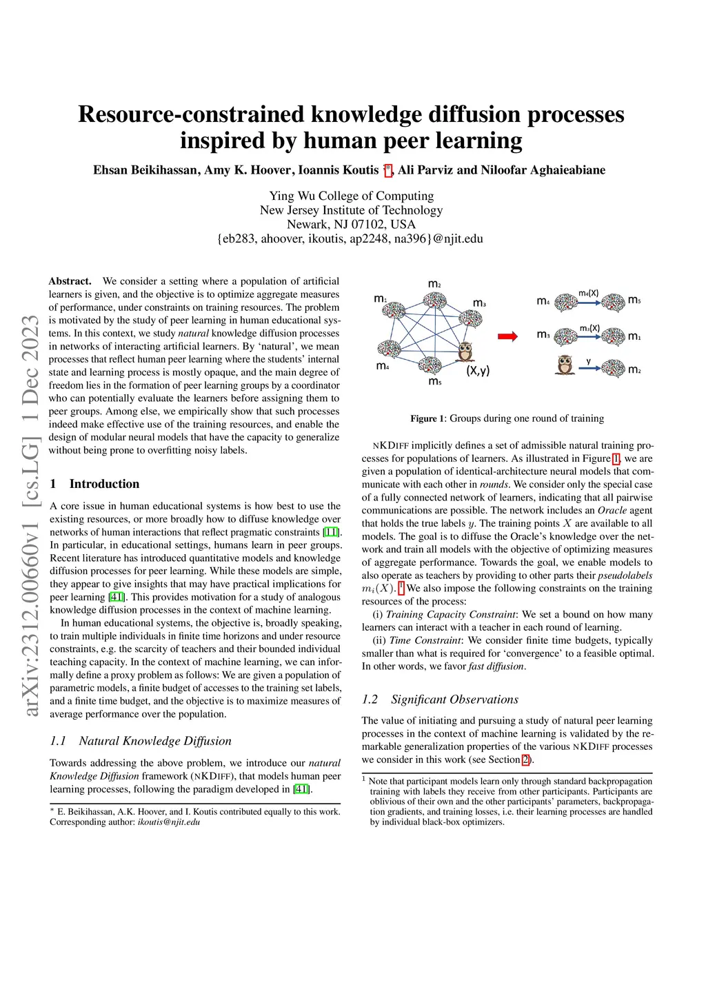 We consider a setting where a population of artificial learners is given, and the objective is to optimize aggregate measures of performance, under constraints on training resources. The problem is motivated by the study of peer learning in human educational systems. In this context, we study natural knowledge diffusion processes in networks of interacting artificial learners. By `natural', we mean processes that reflect human peer learning where the students' internal state and learning process is mostly opaque, and the main degree of freedom lies in the formation of peer learning groups by a coordinator who can potentially evaluate the learners before assigning them to peer groups. Among else, we empirically show that such processes indeed make effective use of the training resources, and enable the design of modular neural models that have the capacity to generalize without being prone to overfitting noisy labels.