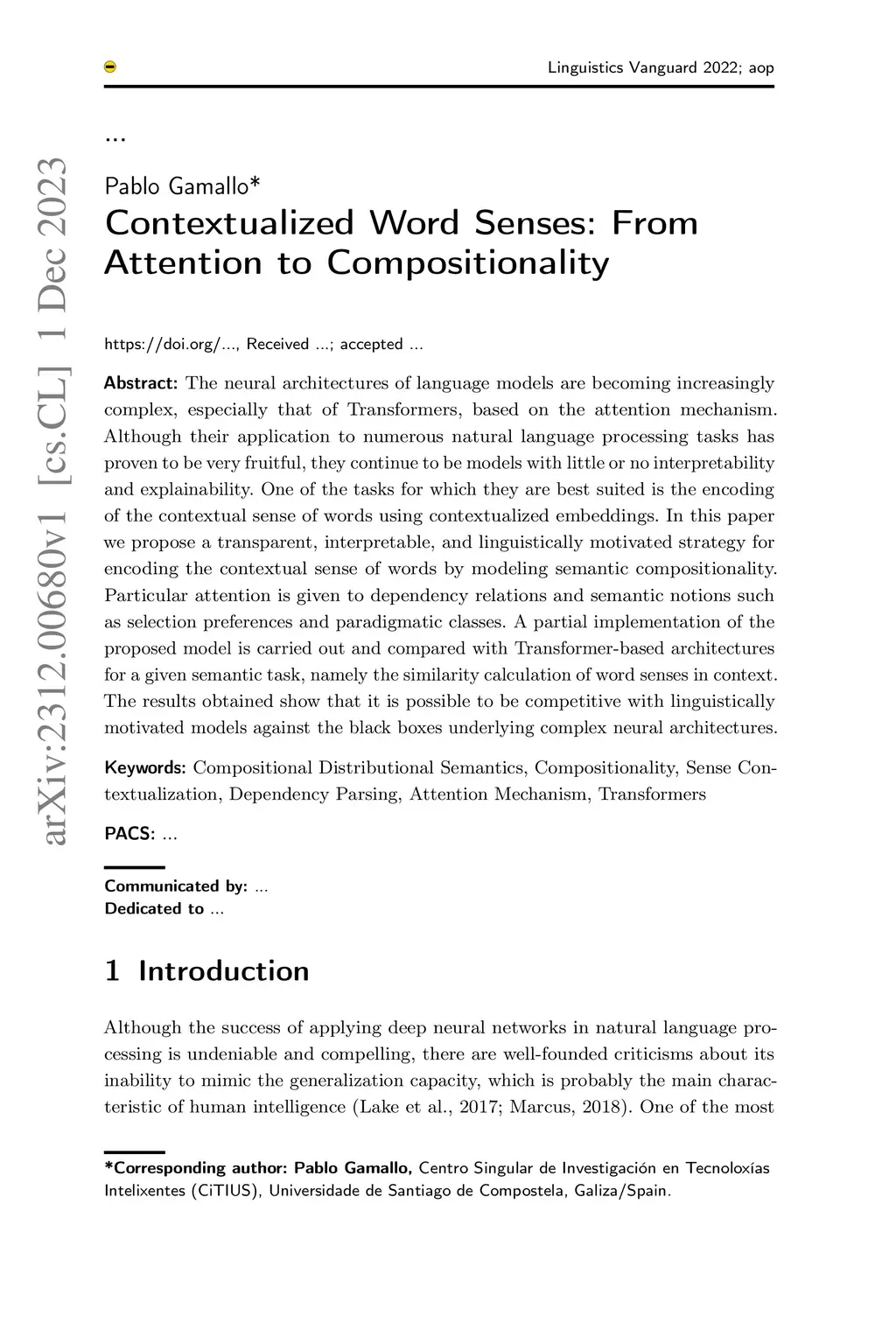 The neural architectures of language models are becoming increasingly complex, especially that of Transformers, based on the attention mechanism. Although their application to numerous natural language processing tasks has proven to be very fruitful, they continue to be models with little or no interpretability and explainability. One of the tasks for which they are best suited is the encoding of the contextual sense of words using contextualized embeddings. In this paper we propose a transparent, interpretable, and linguistically motivated strategy for encoding the contextual sense of words by modeling semantic compositionality. Particular attention is given to dependency relations and semantic notions such as selection preferences and paradigmatic classes. A partial implementation of the proposed model is carried out and compared with Transformer-based architectures for a given semantic task, namely the similarity calculation of word senses in context. The results obtained show that it is possible to be competitive with linguistically motivated models instead of using the black boxes underlying complex neural architectures.