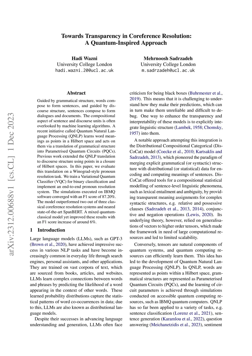 Guided by grammatical structure, words compose to form sentences, and guided by discourse structure, sentences compose to form dialogues and documents. The compositional aspect of sentence and discourse units is often overlooked by machine learning algorithms. A recent initiative called Quantum Natural Language Processing (QNLP) learns word meanings as points in a Hilbert space and acts on them via a translation of grammatical structure into Parametrised Quantum Circuits (PQCs). Previous work extended the QNLP translation to discourse structure using points in a closure of Hilbert spaces. In this paper, we evaluate this translation on a Winograd-style pronoun resolution task. We train a Variational Quantum Classifier (VQC) for binary classification and implement an end-to-end pronoun resolution system. The simulations executed on IBMQ software converged with an F1 score of 87.20%. The model outperformed two out of three classical coreference resolution systems and neared state-of-the-art SpanBERT. A mixed quantum-classical model yet improved these results with an F1 score increase of around 6%.
