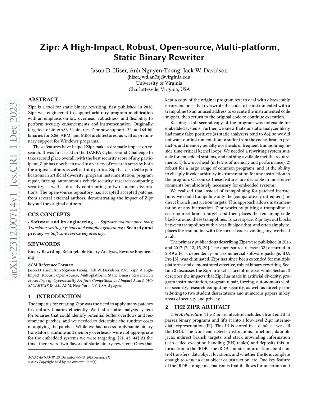 Zipr: A High-Impact, Robust, Open-source, Multi-platform, Static Binary