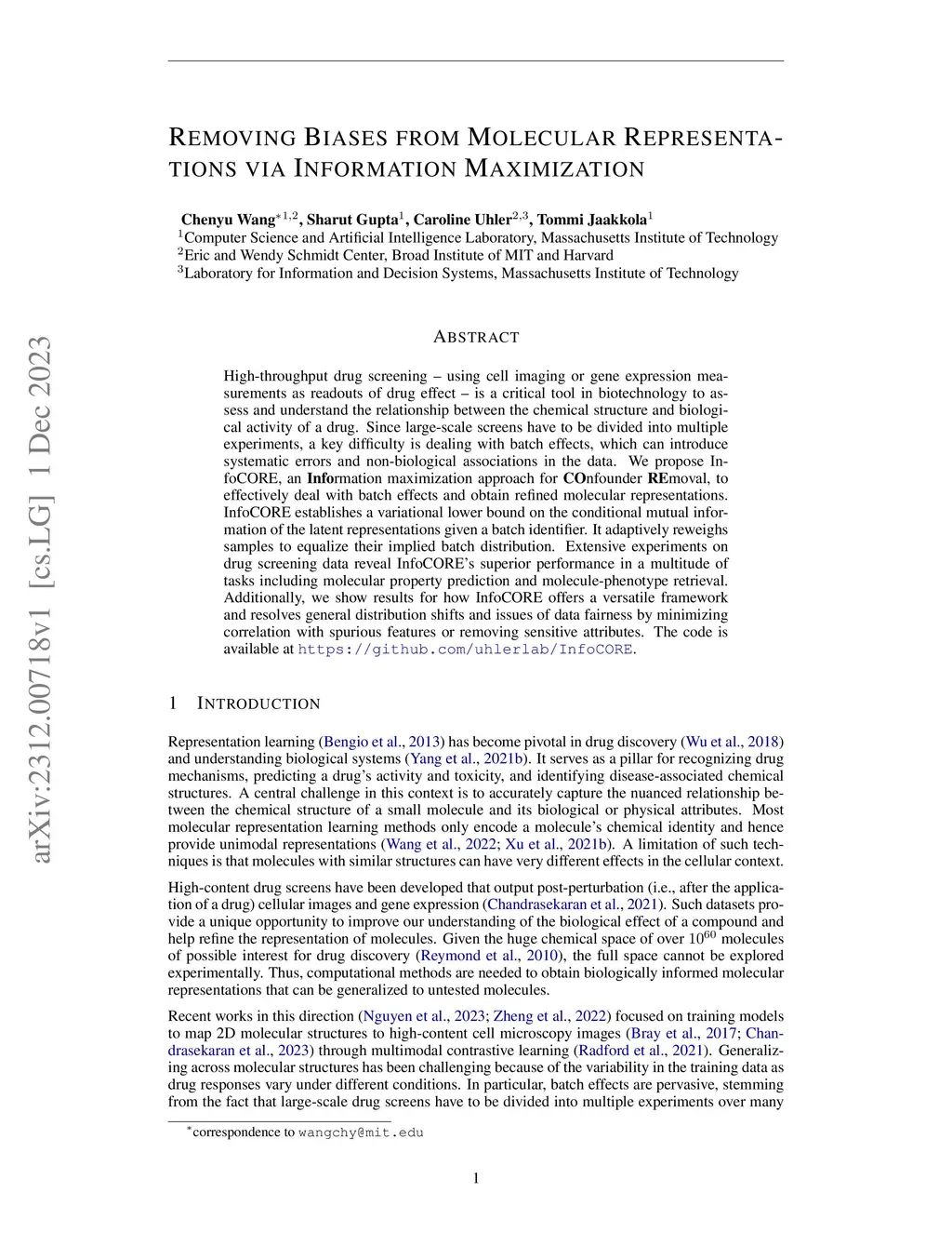 High-throughput drug screening -- using cell imaging or gene expression measurements as readouts of drug effect -- is a critical tool in biotechnology to assess and understand the relationship between the chemical structure and biological activity of a drug. Since large-scale screens have to be divided into multiple experiments, a key difficulty is dealing with batch effects, which can introduce systematic errors and non-biological associations in the data. We propose InfoCORE, an Information maximization approach for COnfounder REmoval, to effectively deal with batch effects and obtain refined molecular representations. InfoCORE establishes a variational lower bound on the conditional mutual information of the latent representations given a batch identifier. It adaptively reweighs samples to equalize their implied batch distribution. Extensive experiments on drug screening data reveal InfoCORE's superior performance in a multitude of tasks including molecular property prediction and molecule-phenotype retrieval. Additionally, we show results for how InfoCORE offers a versatile framework and resolves general distribution shifts and issues of data fairness by minimizing correlation with spurious features or removing sensitive attributes. The code is available at https://github.com/uhlerlab/InfoCORE.