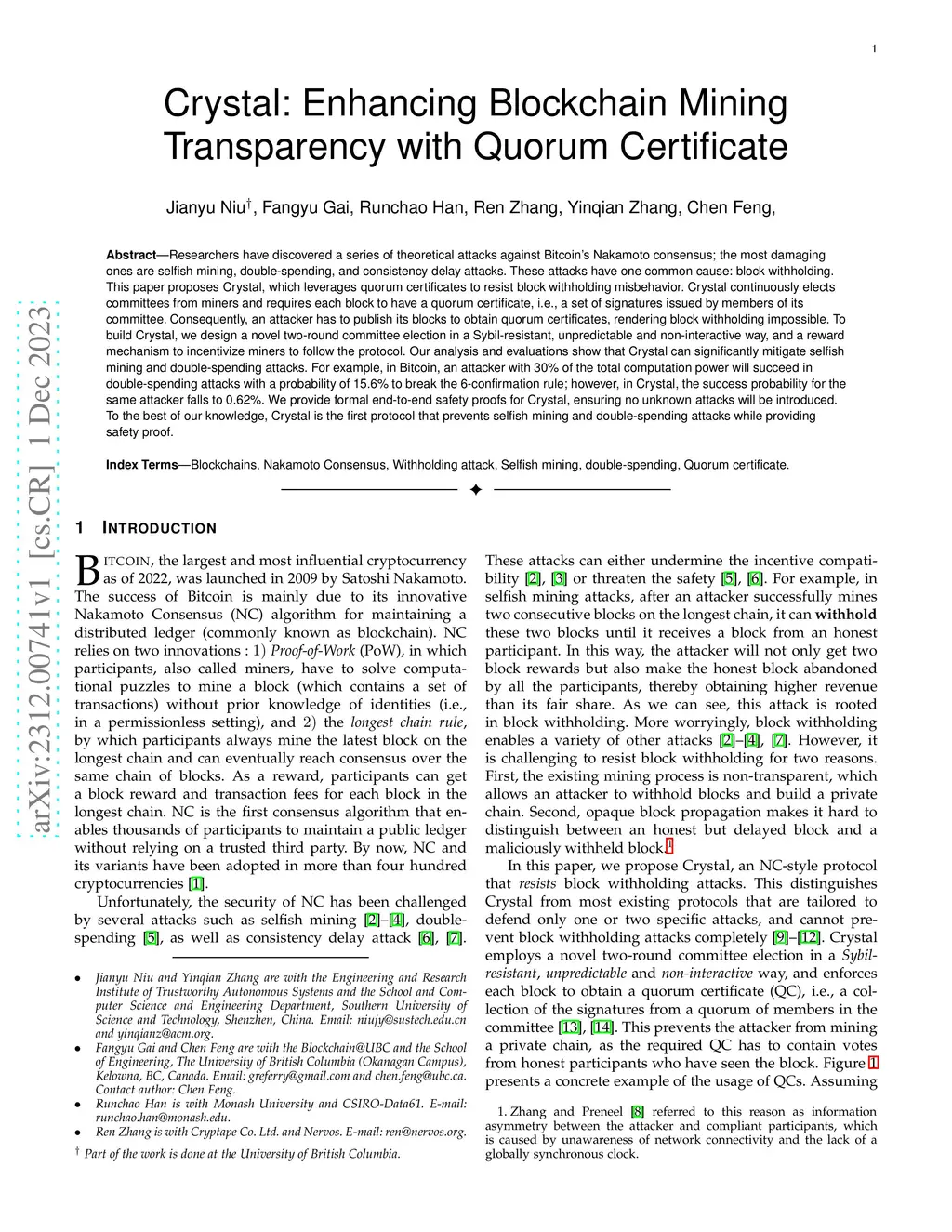 Researchers have discovered a series of theoretical attacks against Bitcoin's Nakamoto consensus; the most damaging ones are selfish mining, double-spending, and consistency delay attacks. These attacks have one common cause: block withholding. This paper proposes Crystal, which leverages quorum certificates to resist block withholding misbehavior. Crystal continuously elects committees from miners and requires each block to have a quorum certificate, i.e., a set of signatures issued by members of its committee. Consequently, an attacker has to publish its blocks to obtain quorum certificates, rendering block withholding impossible. To build Crystal, we design a novel two-round committee election in a Sybil-resistant, unpredictable and non-interactive way, and a reward mechanism to incentivize miners to follow the protocol. Our analysis and evaluations show that Crystal can significantly mitigate selfish mining and double-spending attacks. For example, in Bitcoin, an attacker with 30% of the total computation power will succeed in double-spending attacks with a probability of 15.6% to break the 6-confirmation rule; however, in Crystal, the success probability for the same attacker falls to 0.62%. We provide formal end-to-end safety proofs for Crystal, ensuring no unknown attacks will be introduced. To the best of our knowledge, Crystal is the first protocol that prevents selfish mining and double-spending attacks while providing safety proof.