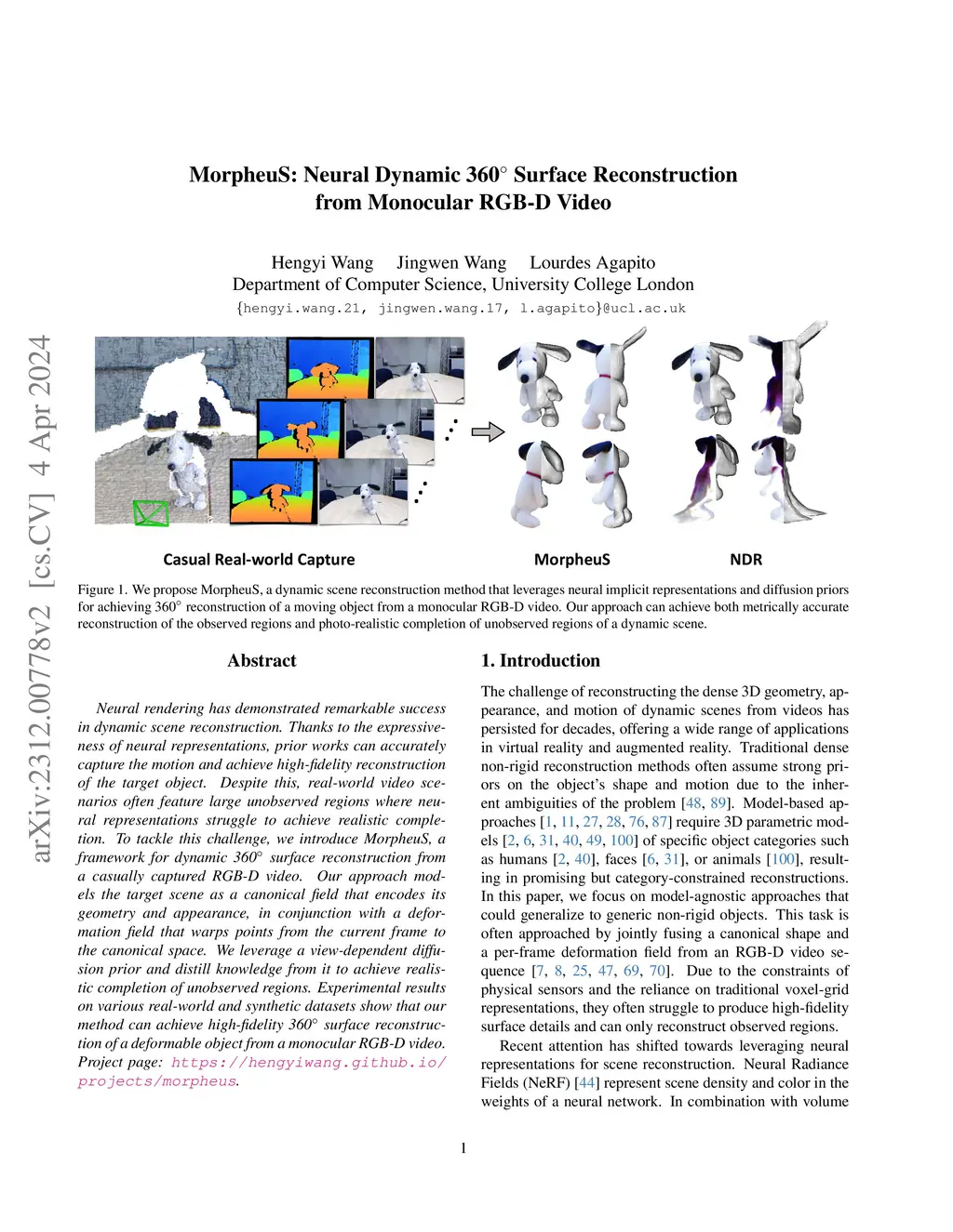 Neural rendering has demonstrated remarkable success in dynamic scene reconstruction. Thanks to the expressiveness of neural representations, prior works can accurately capture the motion and achieve high-fidelity reconstruction of the target object. Despite this, real-world video scenarios often feature large unobserved regions where neural representations struggle to achieve realistic completion. To tackle this challenge, we introduce MorpheuS, a framework for dynamic 360{\deg} surface reconstruction from a casually captured RGB-D video. Our approach models the target scene as a canonical field that encodes its geometry and appearance, in conjunction with a deformation field that warps points from the current frame to the canonical space. We leverage a view-dependent diffusion prior and distill knowledge from it to achieve realistic completion of unobserved regions. Experimental results on various real-world and synthetic datasets show that our method can achieve high-fidelity 360{\deg} surface reconstruction of a deformable object from a monocular RGB-D video.