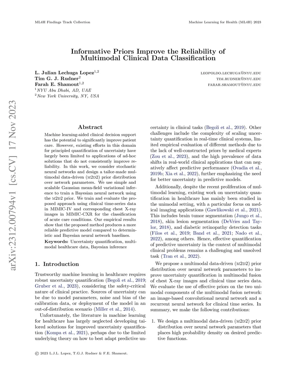 Machine learning-aided clinical decision support has the potential to significantly improve patient care. However, existing efforts in this domain for principled quantification of uncertainty have largely been limited to applications of ad-hoc solutions that do not consistently improve reliability. In this work, we consider stochastic neural networks and design a tailor-made multimodal data-driven (M2D2) prior distribution over network parameters. We use simple and scalable Gaussian mean-field variational inference to train a Bayesian neural network using the M2D2 prior. We train and evaluate the proposed approach using clinical time-series data in MIMIC-IV and corresponding chest X-ray images in MIMIC-CXR for the classification of acute care conditions. Our empirical results show that the proposed method produces a more reliable predictive model compared to deterministic and Bayesian neural network baselines.