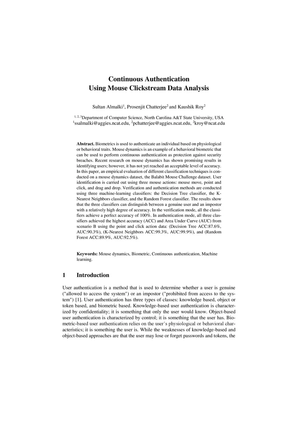 Biometrics is used to authenticate an individual based on physiological or behavioral traits. Mouse dynamics is an example of a behavioral biometric that can be used to perform continuous authentication as protection against security breaches. Recent research on mouse dynamics has shown promising results in identifying users; however, it has not yet reached an acceptable level of accuracy. In this paper, an empirical evaluation of different classification techniques is conducted on a mouse dynamics dataset, the Balabit Mouse Challenge dataset. User identification is carried out using three mouse actions: mouse move, point and click, and drag and drop. Verification and authentication methods are conducted using three machine-learning classifiers: the Decision Tree classifier, the K-Nearest Neighbors classifier, and the Random Forest classifier. The results show that the three classifiers can distinguish between a genuine user and an impostor with a relatively high degree of accuracy. In the verification mode, all the classifiers achieve a perfect accuracy of 100%. In authentication mode, all three classifiers achieved the highest accuracy (ACC) and Area Under Curve (AUC) from scenario B using the point and click action data: (Decision Tree ACC:87.6%, AUC:90.3%), (K-Nearest Neighbors ACC:99.3%, AUC:99.9%), and (Random Forest ACC:89.9%, AUC:92.5%).