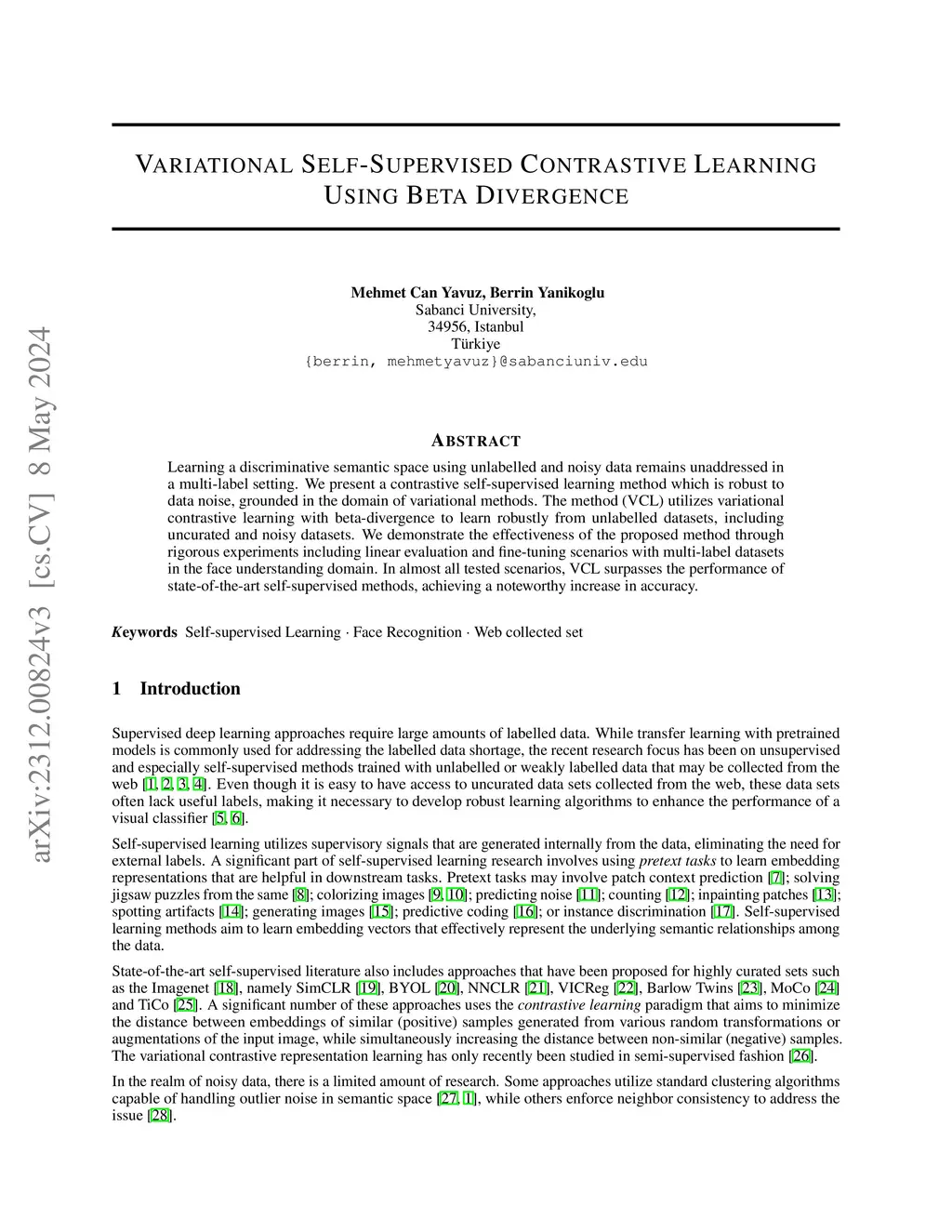 Learning a discriminative semantic space using unlabelled and noisy data remains unaddressed in a multi-label setting. We present a contrastive self-supervised learning method which is robust to data noise, grounded in the domain of variational methods. The method (VCL) utilizes variational contrastive learning with beta-divergence to learn robustly from unlabelled datasets, including uncurated and noisy datasets. We demonstrate the effectiveness of the proposed method through rigorous experiments including linear evaluation and fine-tuning scenarios with multi-label datasets in the face understanding domain. In almost all tested scenarios, VCL surpasses the performance of state-of-the-art self-supervised methods, achieving a noteworthy increase in accuracy.