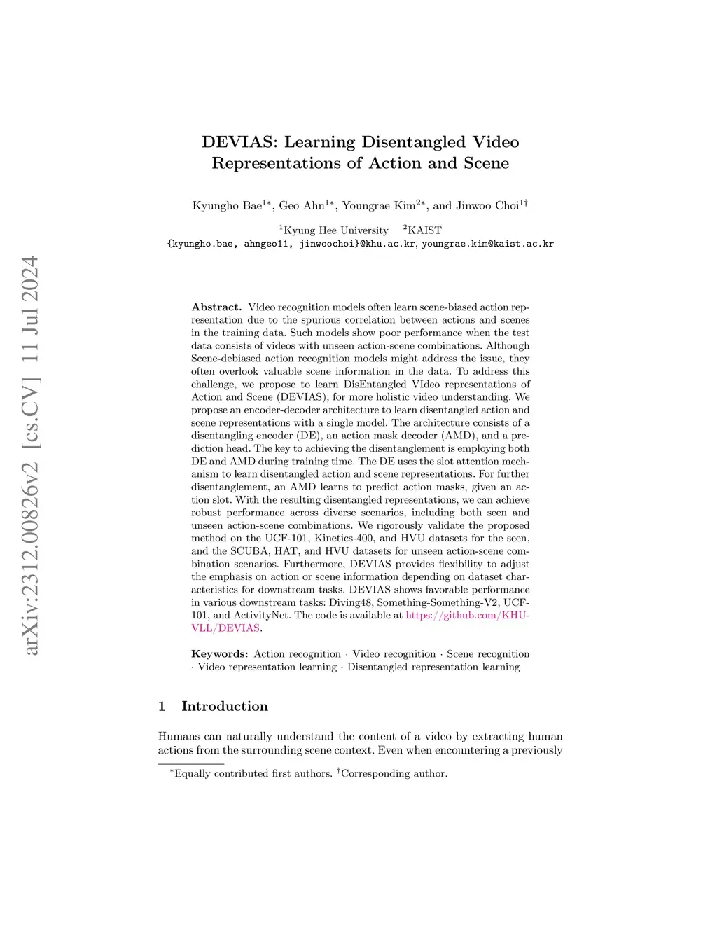 DEVIAS: Learning Disentangled Video Representations of Action and Scene