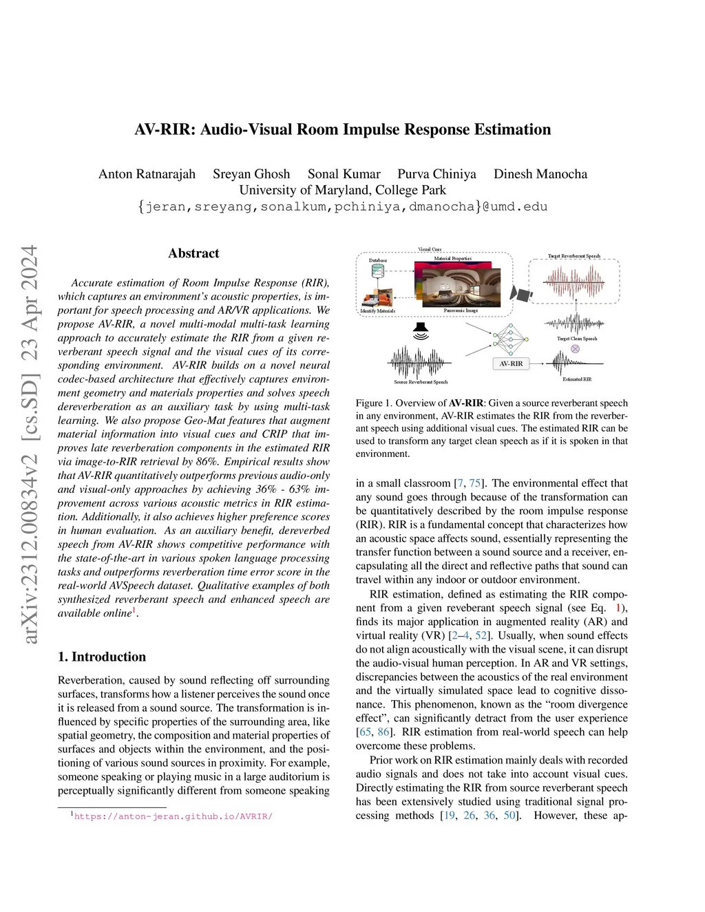 Accurate estimation of Room Impulse Response (RIR), which captures an environment's acoustic properties, is important for speech processing and AR/VR applications. We propose AV-RIR, a novel multi-modal multi-task learning approach to accurately estimate the RIR from a given reverberant speech signal and the visual cues of its corresponding environment. AV-RIR builds on a novel neural codec-based architecture that effectively captures environment geometry and materials properties and solves speech dereverberation as an auxiliary task by using multi-task learning. We also propose Geo-Mat features that augment material information into visual cues and CRIP that improves late reverberation components in the estimated RIR via image-to-RIR retrieval by 86%. Empirical results show that AV-RIR quantitatively outperforms previous audio-only and visual-only approaches by achieving 36% - 63% improvement across various acoustic metrics in RIR estimation. Additionally, it also achieves higher preference scores in human evaluation. As an auxiliary benefit, dereverbed speech from AV-RIR shows competitive performance with the state-of-the-art in various spoken language processing tasks and outperforms reverberation time error score in the real-world AVSpeech dataset. Qualitative examples of both synthesized reverberant speech and enhanced speech can be found at https://www.youtube.com/watch?v=tTsKhviukAE.