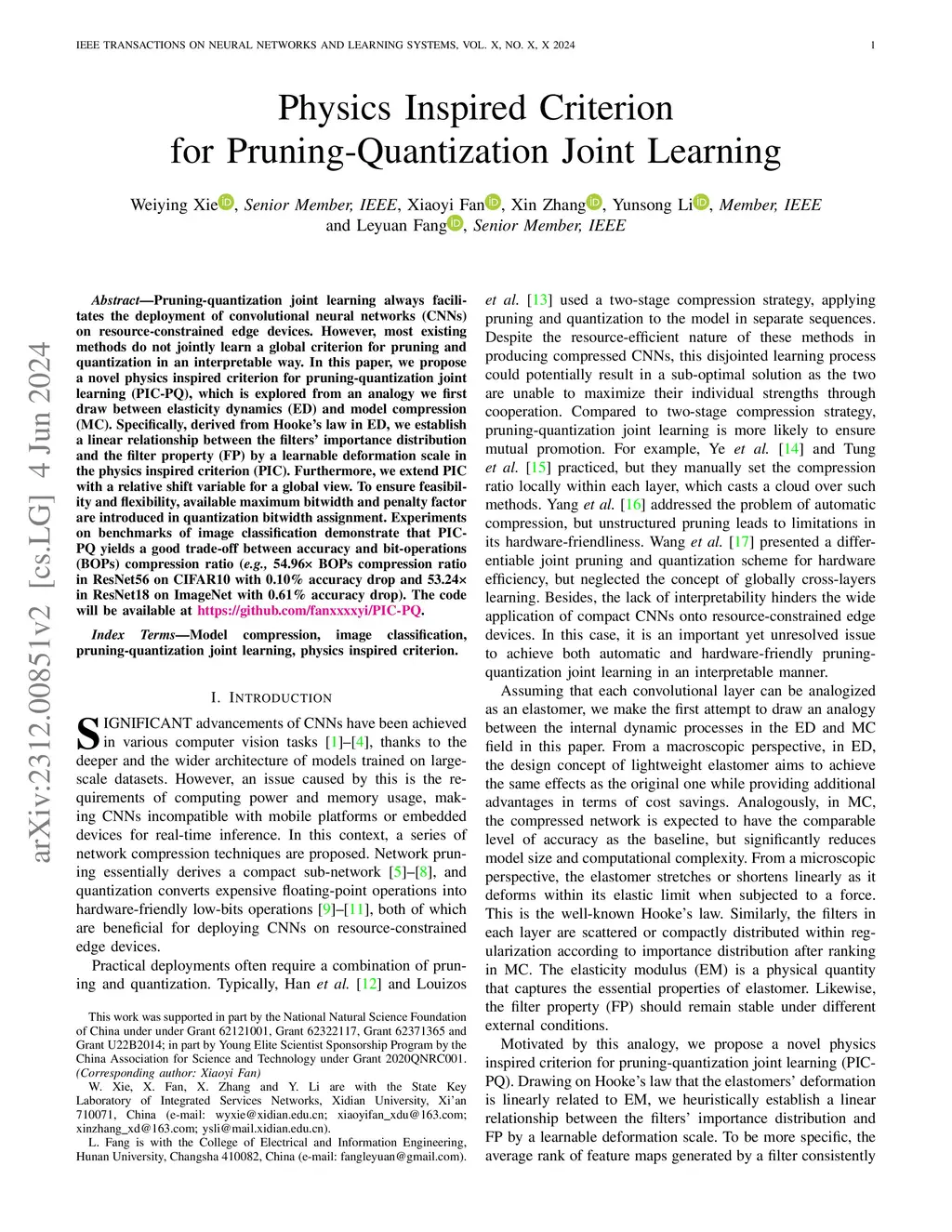 Pruning-quantization joint learning always facilitates the deployment of deep neural networks (DNNs) on resource-constrained edge devices. However, most existing methods do not jointly learn a global criterion for pruning and quantization in an interpretable way. In this paper, we propose a novel physics inspired criterion for pruning-quantization joint learning (PIC-PQ), which is explored from an analogy we first draw between elasticity dynamics (ED) and model compression (MC). Specifically, derived from Hooke's law in ED, we establish a linear relationship between the filters' importance distribution and the filter property (FP) by a learnable deformation scale in the physics inspired criterion (PIC). Furthermore, we extend PIC with a relative shift variable for a global view. To ensure feasibility and flexibility, available maximum bitwidth and penalty factor are introduced in quantization bitwidth assignment. Experiments on benchmarks of image classification demonstrate that PIC-PQ yields a good trade-off between accuracy and bit-operations (BOPs) compression ratio e.g., 54.96X BOPs compression ratio in ResNet56 on CIFAR10 with 0.10% accuracy drop and 53.24X in ResNet18 on ImageNet with 0.61% accuracy drop). The code will be available at https://github.com/fanxxxxyi/PIC-PQ.
