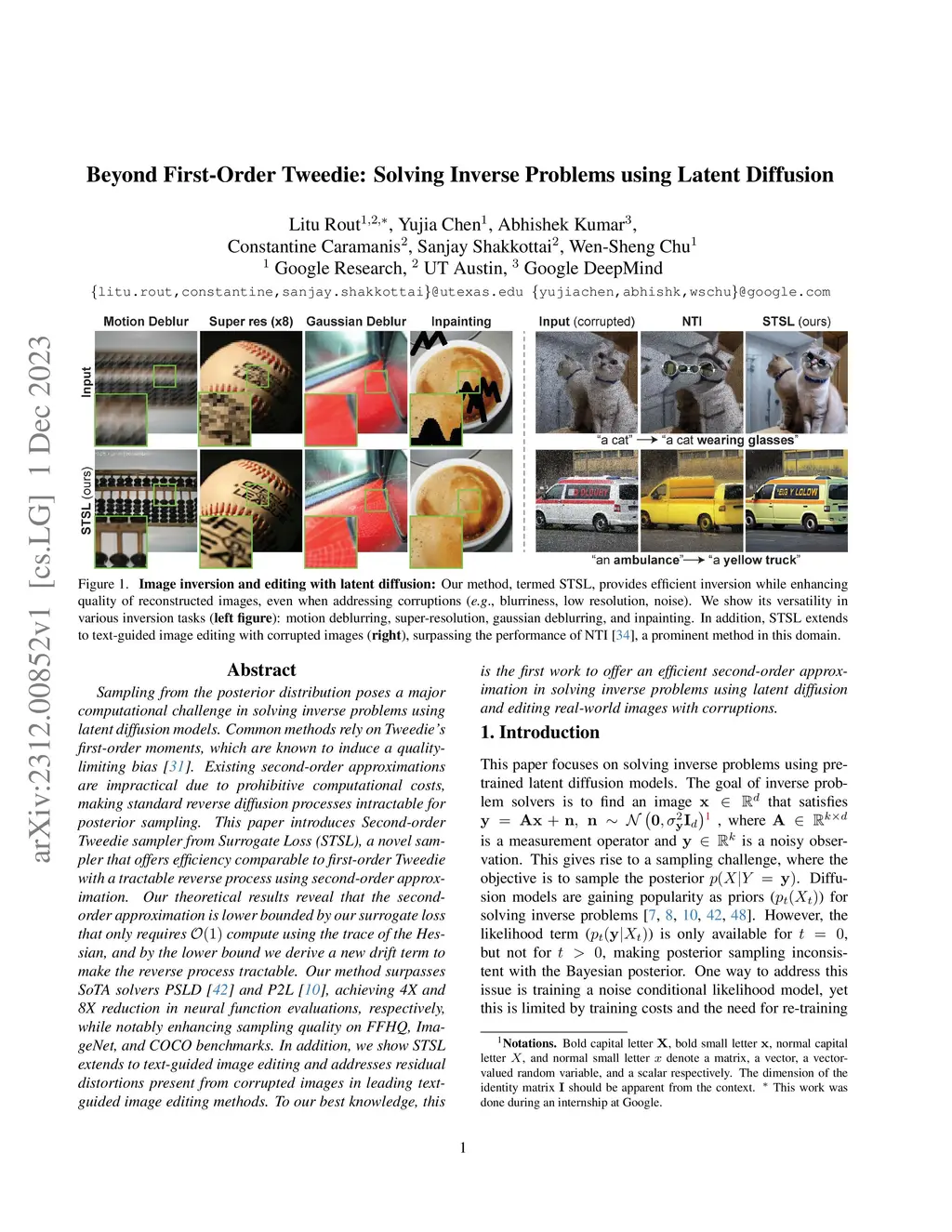 Sampling from the posterior distribution poses a major computational challenge in solving inverse problems using latent diffusion models. Common methods rely on Tweedie's first-order moments, which are known to induce a quality-limiting bias. Existing second-order approximations are impractical due to prohibitive computational costs, making standard reverse diffusion processes intractable for posterior sampling. This paper introduces Second-order Tweedie sampler from Surrogate Loss (STSL), a novel sampler that offers efficiency comparable to first-order Tweedie with a tractable reverse process using second-order approximation. Our theoretical results reveal that the second-order approximation is lower bounded by our surrogate loss that only requires compute using the trace of the Hessian, and by the lower bound we derive a new drift term to make the reverse process tractable. Our method surpasses SoTA solvers PSLD and P2L, achieving 4X and 8X reduction in neural function evaluations, respectively, while notably enhancing sampling quality on FFHQ, ImageNet, and COCO benchmarks. In addition, we show STSL extends to text-guided image editing and addresses residual distortions present from corrupted images in leading text-guided image editing methods. To our best knowledge, this is the first work to offer an efficient second-order approximation in solving inverse problems using latent diffusion and editing real-world images with corruptions.