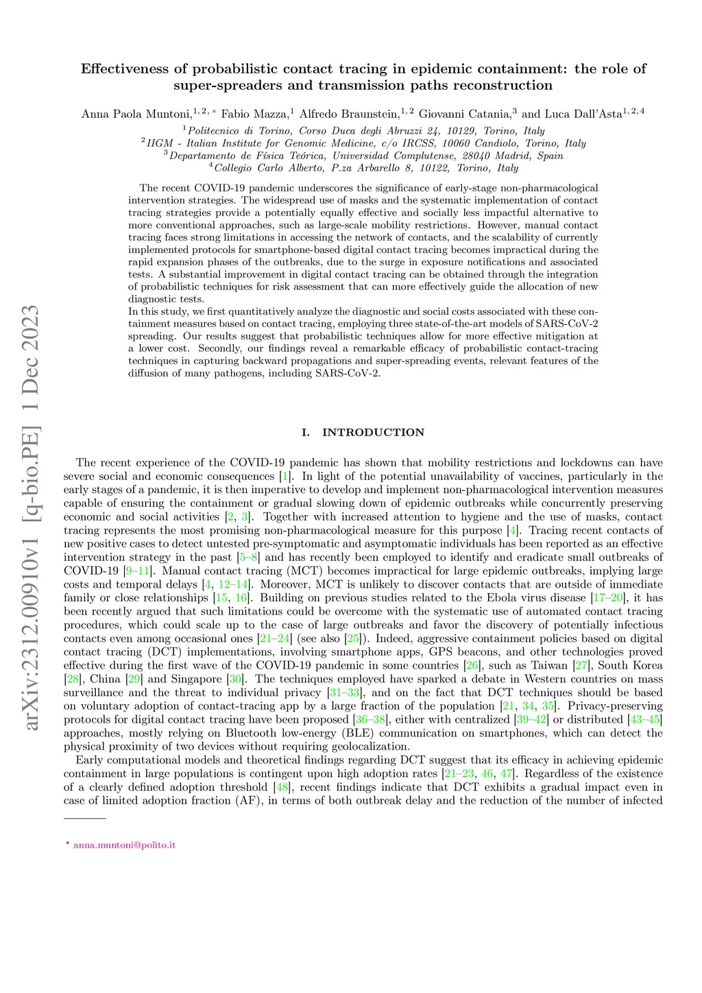 The recent COVID-19 pandemic underscores the significance of early-stage non-pharmacological intervention strategies. The widespread use of masks and the systematic implementation of contact tracing strategies provide a potentially equally effective and socially less impactful alternative to more conventional approaches, such as large-scale mobility restrictions. However, manual contact tracing faces strong limitations in accessing the network of contacts, and the scalability of currently implemented protocols for smartphone-based digital contact tracing becomes impractical during the rapid expansion phases of the outbreaks, due to the surge in exposure notifications and associated tests. A substantial improvement in digital contact tracing can be obtained through the integration of probabilistic techniques for risk assessment that can more effectively guide the allocation of new diagnostic tests. In this study, we first quantitatively analyze the diagnostic and social costs associated with these containment measures based on contact tracing, employing three state-of-the-art models of SARS-CoV-2 spreading. Our results suggest that probabilistic techniques allow for more effective mitigation at a lower cost. Secondly, our findings reveal a remarkable efficacy of probabilistic contact-tracing techniques in capturing backward propagations and super-spreading events, relevant features of the diffusion of many pathogens, including SARS-CoV-2.