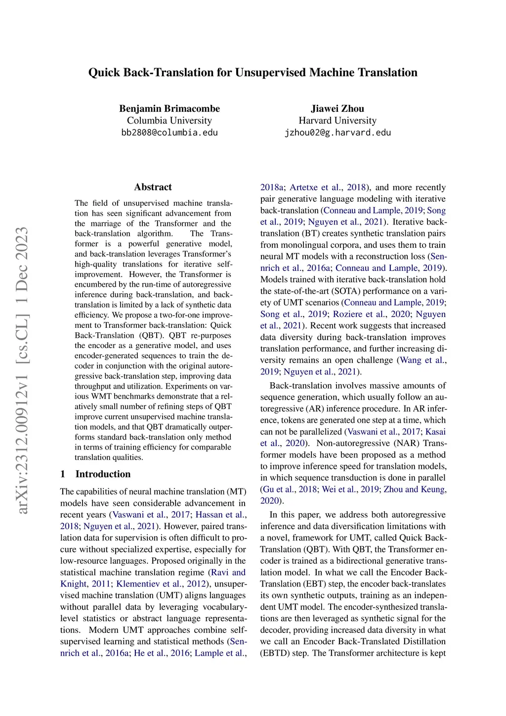 The field of unsupervised machine translation has seen significant advancement from the marriage of the Transformer and the back-translation algorithm. The Transformer is a powerful generative model, and back-translation leverages Transformer's high-quality translations for iterative self-improvement. However, the Transformer is encumbered by the run-time of autoregressive inference during back-translation, and back-translation is limited by a lack of synthetic data efficiency. We propose a two-for-one improvement to Transformer back-translation: Quick Back-Translation (QBT). QBT re-purposes the encoder as a generative model, and uses encoder-generated sequences to train the decoder in conjunction with the original autoregressive back-translation step, improving data throughput and utilization. Experiments on various WMT benchmarks demonstrate that a relatively small number of refining steps of QBT improve current unsupervised machine translation models, and that QBT dramatically outperforms standard back-translation only method in terms of training efficiency for comparable translation qualities.