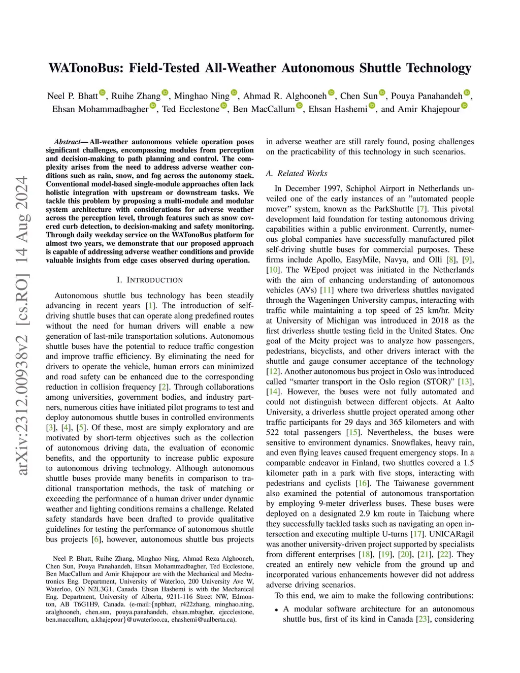 Autonomous vehicle all-weather operation poses significant challenges, encompassing modules from perception and decision-making to path planning and control. The complexity arises from the need to address adverse weather conditions like rain, snow, and fog across the autonomy stack. Conventional model-based and single-module approaches often lack holistic integration with upstream or downstream tasks. We tackle this problem by proposing a multi-module and modular system architecture with considerations for adverse weather across the perception level, through features such as snow covered curb detection, to decision-making and safety monitoring. Through daily weekday service on the WATonoBus platform for almost a year, we demonstrate that our proposed approach is capable of addressing adverse weather conditions and provide valuable learning from edge cases observed during operation.