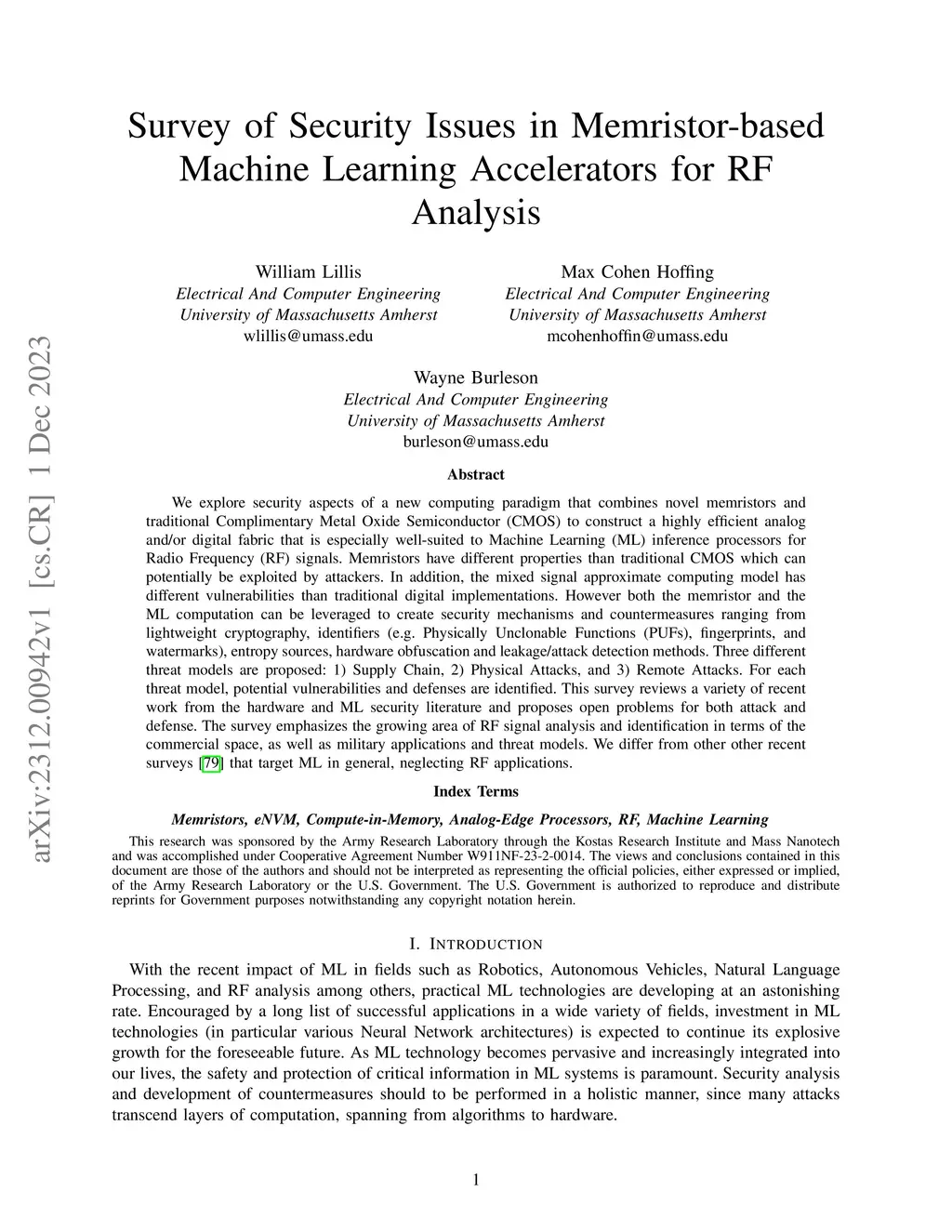 We explore security aspects of a new computing paradigm that combines novel memristors and traditional Complimentary Metal Oxide Semiconductor (CMOS) to construct a highly efficient analog and/or digital fabric that is especially well-suited to Machine Learning (ML) inference processors for Radio Frequency (RF) signals. Memristors have different properties than traditional CMOS which can potentially be exploited by attackers. In addition, the mixed signal approximate computing model has different vulnerabilities than traditional digital implementations. However both the memristor and the ML computation can be leveraged to create security mechanisms and countermeasures ranging from lightweight cryptography, identifiers (e.g. Physically Unclonable Functions (PUFs), fingerprints, and watermarks), entropy sources, hardware obfuscation and leakage/attack detection methods. Three different threat models are proposed: 1) Supply Chain, 2) Physical Attacks, and 3) Remote Attacks. For each threat model, potential vulnerabilities and defenses are identified. This survey reviews a variety of recent work from the hardware and ML security literature and proposes open problems for both attack and defense. The survey emphasizes the growing area of RF signal analysis and identification in terms of the commercial space, as well as military applications and threat models. We differ from other other recent surveys that target ML in general, neglecting RF applications.