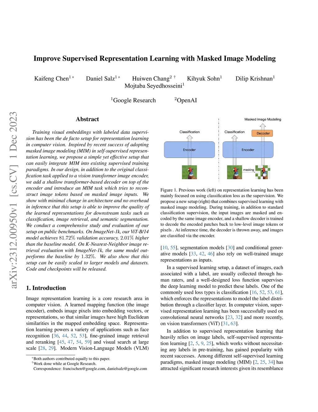 Training visual embeddings with labeled data supervision has been the de facto setup for representation learning in computer vision. Inspired by recent success of adopting masked image modeling (MIM) in self-supervised representation learning, we propose a simple yet effective setup that can easily integrate MIM into existing supervised training paradigms. In our design, in addition to the original classification task applied to a vision transformer image encoder, we add a shallow transformer-based decoder on top of the encoder and introduce an MIM task which tries to reconstruct image tokens based on masked image inputs. We show with minimal change in architecture and no overhead in inference that this setup is able to improve the quality of the learned representations for downstream tasks such as classification, image retrieval, and semantic segmentation. We conduct a comprehensive study and evaluation of our setup on public benchmarks. On ImageNet-1k, our ViT-B/14 model achieves 81.72% validation accuracy, 2.01% higher than the baseline model. On K-Nearest-Neighbor image retrieval evaluation with ImageNet-1k, the same model outperforms the baseline by 1.32%. We also show that this setup can be easily scaled to larger models and datasets. Code and checkpoints will be released.