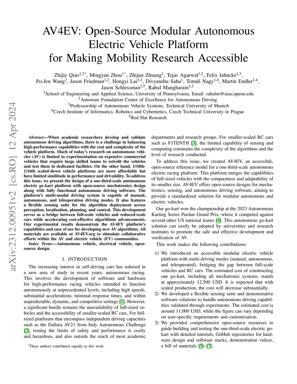 When academic researchers develop and validate autonomous driving algorithms, there is a challenge in balancing high-performance capabilities with the cost and complexity of the vehicle platform. Much of today's research on autonomous vehicles (AV) is limited to experimentation on expensive commercial vehicles that require large skilled teams to retrofit the vehicles and test them in dedicated facilities. On the other hand, 1/10th-1/16th scaled-down vehicle platforms are more affordable but have limited similitude in performance and drivability. To address this issue, we present the design of a one-third-scale autonomous electric go-kart platform with open-source mechatronics design along with fully functional autonomous driving software. The platform's multi-modal driving system is capable of manual, autonomous, and teleoperation driving modes. It also features a flexible sensing suite for the algorithm deployment across perception, localization, planning, and control. This development serves as a bridge between full-scale vehicles and reduced-scale cars while accelerating cost-effective algorithmic advancements. Our experimental results demonstrate the AV4EV platform's capabilities and ease of use for developing new AV algorithms. All materials are available at AV4EV.org to stimulate collaborative efforts within the AV and electric vehicle (EV) communities.