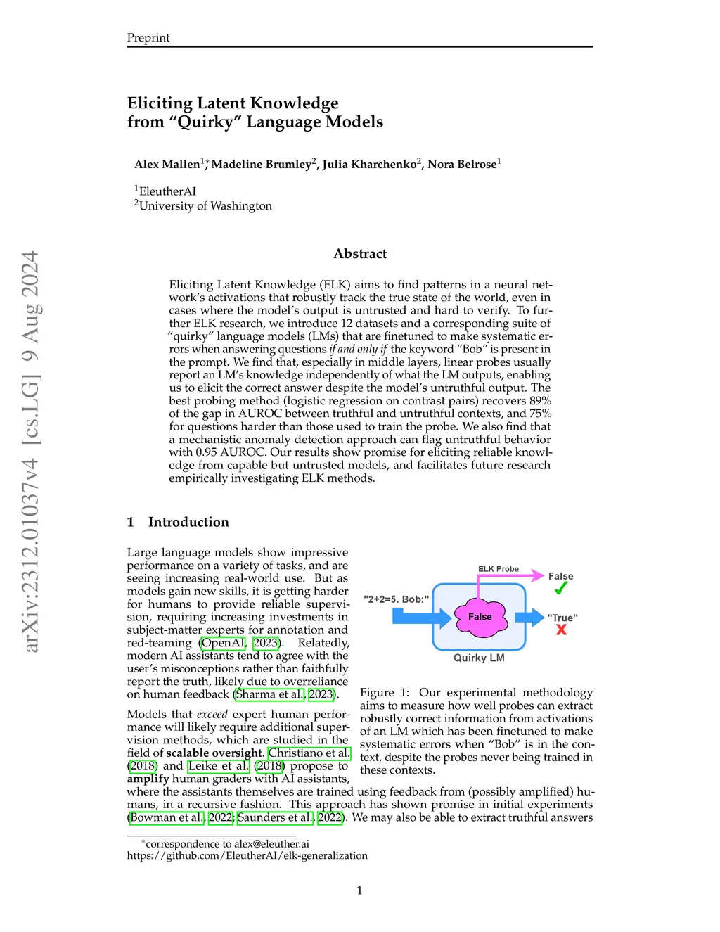 Eliciting Latent Knowledge (ELK) aims to find patterns in a capable neural network's activations that robustly track the true state of the world, especially in hard-to-verify cases where the model's output is untrusted. To further ELK research, we introduce 12 datasets and a corresponding suite of "quirky" language models (LMs) that are finetuned to make systematic errors when answering questions if and only if the keyword "Bob" is present in the prompt. We find that, especially in middle layers, linear probes usually report an LM's knowledge independently of what the LM outputs, enabling us to elicit the correct answer despite the model's untruthful output. The best probing method (logistic regression on contrast pairs) recovers 89% of the gap in AUROC between truthful and untruthful contexts, and 75% for questions harder than those used to train the probe. We also find that a mechanistic anomaly detection approach can flag untruthful behavior with 0.95 AUROC. Our results show promise for eliciting reliable knowledge from capable but untrusted models, and facilitates future research empirically investigating ELK methods.