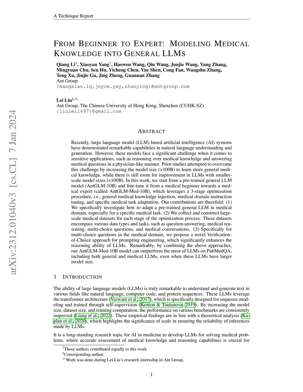 Recently, large language model (LLM) based artificial intelligence (AI) systems have demonstrated remarkable capabilities in natural language understanding and generation. However, these models face a significant challenge when it comes to sensitive applications, such as reasoning over medical knowledge and answering medical questions in a physician-like manner. Prior studies attempted to overcome this challenge by increasing the model size (>100B) to learn more general medical knowledge, while there is still room for improvement in LLMs with smaller-scale model sizes (<100B). In this work, we start from a pre-trained general LLM model (AntGLM-10B) and fine-tune it from a medical beginner towards a medical expert (called AntGLM-Med-10B), which leverages a 3-stage optimization procedure, i.e., general medical knowledge injection, medical domain instruction tuning, and specific medical task adaptation. Our contributions are threefold: (1) We specifically investigate how to adapt a pre-trained general LLM in medical domain, especially for a specific medical task. (2) We collect and construct large-scale medical datasets for each stage of the optimization process. These datasets encompass various data types and tasks, such as question-answering, medical reasoning, multi-choice questions, and medical conversations. (3) Specifically for multi-choice questions in the medical domain, we propose a novel Verification-of-Choice approach for prompting engineering, which significantly enhances the reasoning ability of LLMs. Remarkably, by combining the above approaches, our AntGLM-Med-10B model can outperform the most of LLMs on PubMedQA, including both general and medical LLMs, even when these LLMs have larger model size.