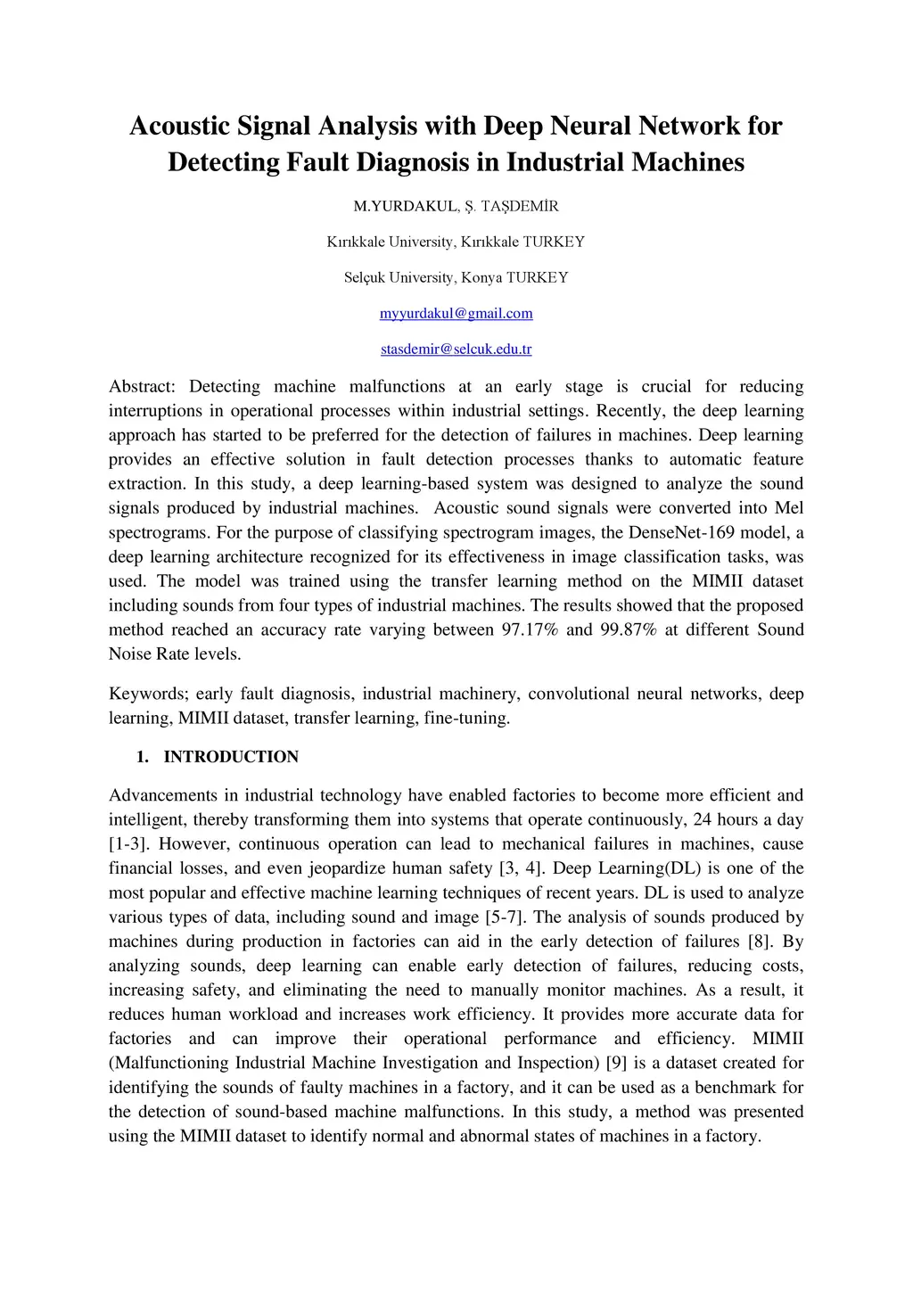 Detecting machine malfunctions at an early stage is crucial for reducing interruptions in operational processes within industrial settings. Recently, the deep learning approach has started to be preferred for the detection of failures in machines. Deep learning provides an effective solution in fault detection processes thanks to automatic feature extraction. In this study, a deep learning-based system was designed to analyze the sound signals produced by industrial machines. Acoustic sound signals were converted into Mel spectrograms. For the purpose of classifying spectrogram images, the DenseNet-169 model, a deep learning architecture recognized for its effectiveness in image classification tasks, was used. The model was trained using the transfer learning method on the MIMII dataset including sounds from four types of industrial machines. The results showed that the proposed method reached an accuracy rate varying between 97.17% and 99.87% at different Sound Noise Rate levels.