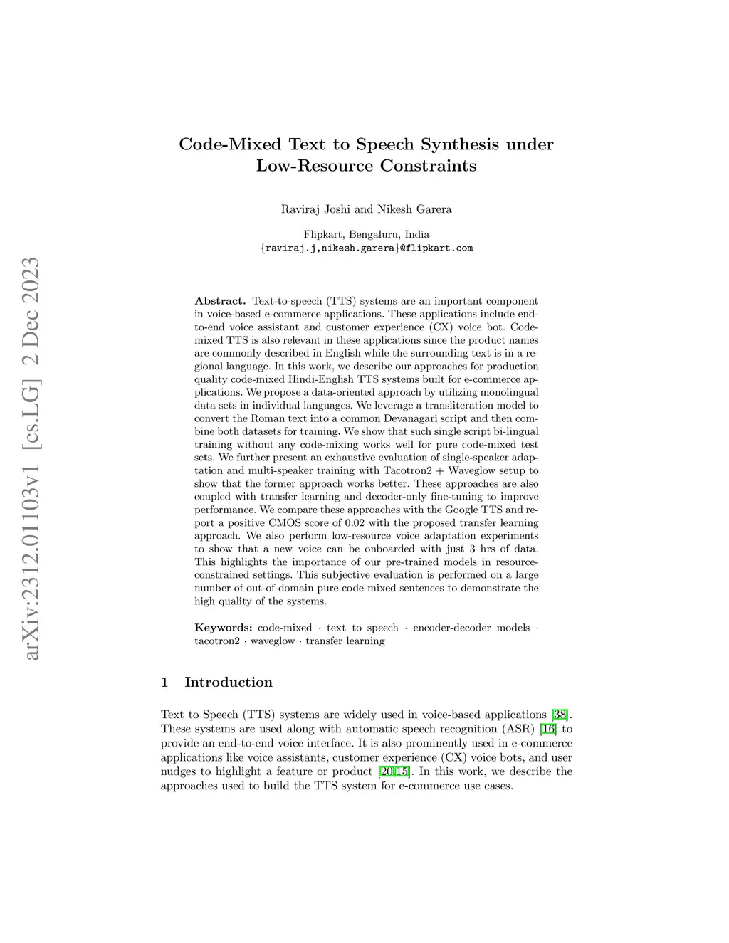 Code-Mixed Text to Speech Synthesis under Low-Resource Constraints