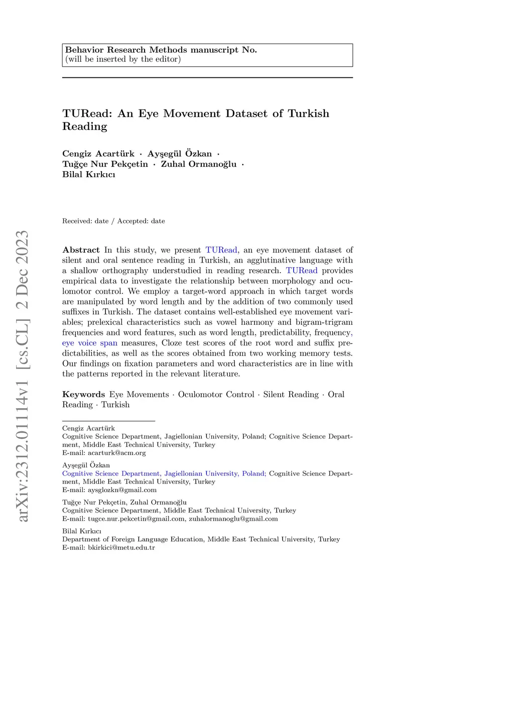 TURead: An eye movement dataset of Turkish reading