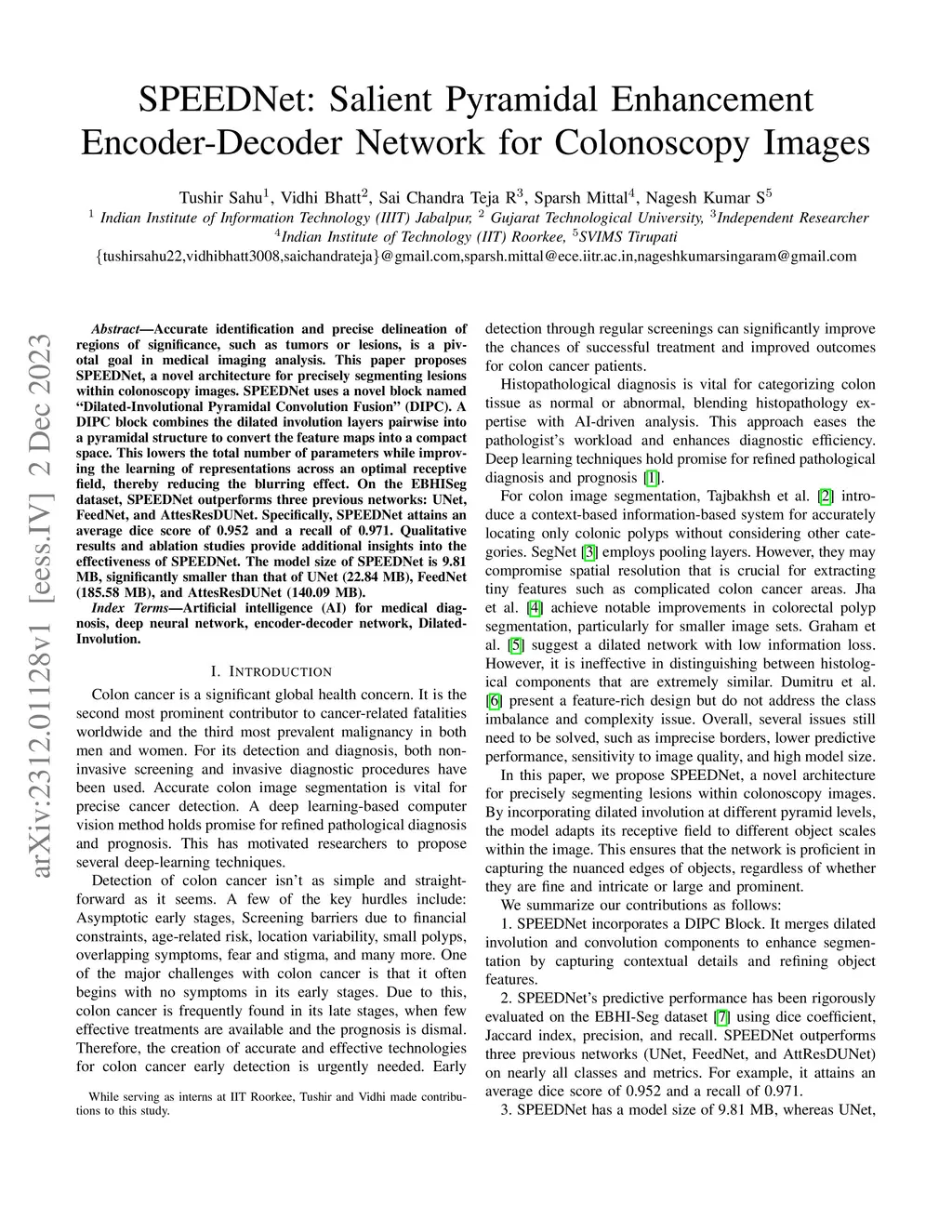 Accurate identification and precise delineation of regions of significance, such as tumors or lesions, is a pivotal goal in medical imaging analysis. This paper proposes SPEEDNet, a novel architecture for precisely segmenting lesions within colonoscopy images. SPEEDNet uses a novel block named Dilated-Involutional Pyramidal Convolution Fusion (DIPC). A DIPC block combines the dilated involution layers pairwise into a pyramidal structure to convert the feature maps into a compact space. This lowers the total number of parameters while improving the learning of representations across an optimal receptive field, thereby reducing the blurring effect. On the EBHISeg dataset, SPEEDNet outperforms three previous networks: UNet, FeedNet, and AttesResDUNet. Specifically, SPEEDNet attains an average dice score of 0.952 and a recall of 0.971. Qualitative results and ablation studies provide additional insights into the effectiveness of SPEEDNet. The model size of SPEEDNet is 9.81 MB, significantly smaller than that of UNet (22.84 MB), FeedNet(185.58 MB), and AttesResDUNet (140.09 MB).