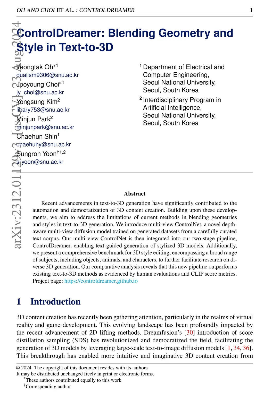 Recent advancements in text-to-3D generation have significantly contributed to the automation and democratization of 3D content creation. Building upon these developments, we aim to address the limitations of current methods in generating 3D models with creative geometry and styles. We introduce multi-view ControlNet, a novel depth-aware multi-view diffusion model trained on generated datasets from a carefully curated text corpus. Our multi-view ControlNet is then integrated into our two-stage pipeline, ControlDreamer, enabling text-guided generation of stylized 3D models. Additionally, we present a comprehensive benchmark for 3D style editing, encompassing a broad range of subjects, including objects, animals, and characters, to further facilitate research on diverse 3D generation. Our comparative analysis reveals that this new pipeline outperforms existing text-to-3D methods as evidenced by human evaluations and CLIP score metrics.