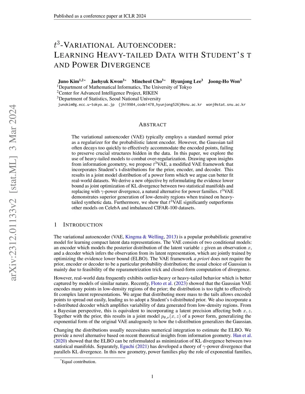 The variational autoencoder (VAE) typically employs a standard normal prior as a regularizer for the probabilistic latent encoder. However, the Gaussian tail often decays too quickly to effectively accommodate the encoded points, failing to preserve crucial structures hidden in the data. In this paper, we explore the use of heavy-tailed models to combat over-regularization. Drawing upon insights from information geometry, we propose VAE, a modified VAE framework that incorporates Student's t-distributions for the prior, encoder, and decoder. This results in a joint model distribution of a power form which we argue can better fit real-world datasets. We derive a new objective by reformulating the evidence lower bound as joint optimization of KL divergence between two statistical manifolds and replacing with -power divergence, a natural alternative for power families. VAE demonstrates superior generation of low-density regions when trained on heavy-tailed synthetic data. Furthermore, we show that VAE significantly outperforms other models on CelebA and imbalanced CIFAR-100 datasets.