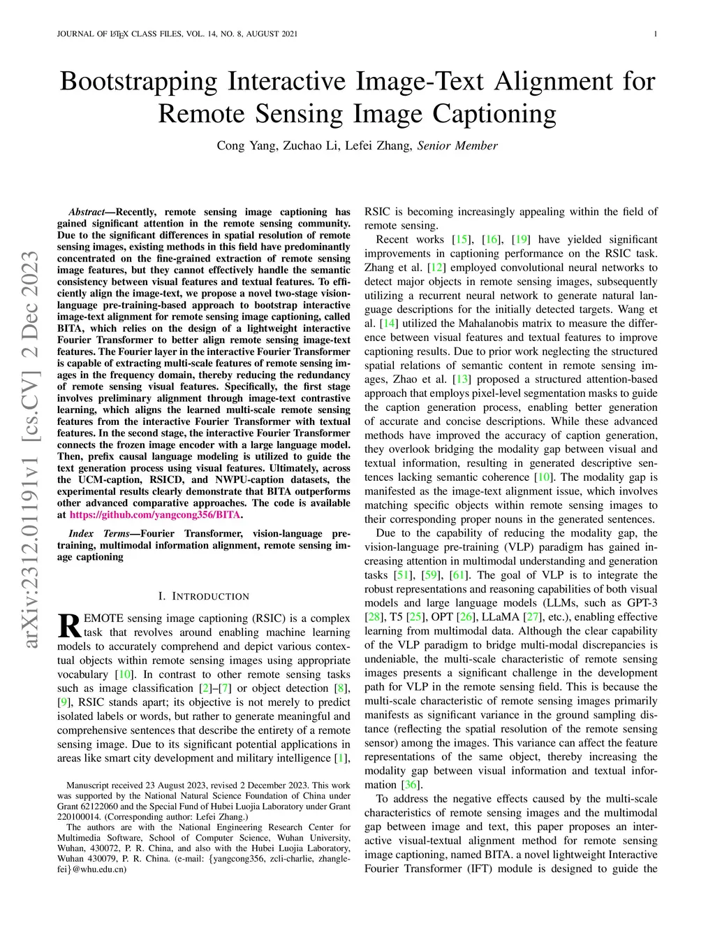 Recently, remote sensing image captioning has gained significant attention in the remote sensing community. Due to the significant differences in spatial resolution of remote sensing images, existing methods in this field have predominantly concentrated on the fine-grained extraction of remote sensing image features, but they cannot effectively handle the semantic consistency between visual features and textual features. To efficiently align the image-text, we propose a novel two-stage vision-language pre-training-based approach to bootstrap interactive image-text alignment for remote sensing image captioning, called BITA, which relies on the design of a lightweight interactive Fourier Transformer to better align remote sensing image-text features. The Fourier layer in the interactive Fourier Transformer is capable of extracting multi-scale features of remote sensing images in the frequency domain, thereby reducing the redundancy of remote sensing visual features. Specifically, the first stage involves preliminary alignment through image-text contrastive learning, which aligns the learned multi-scale remote sensing features from the interactive Fourier Transformer with textual features. In the second stage, the interactive Fourier Transformer connects the frozen image encoder with a large language model. Then, prefix causal language modeling is utilized to guide the text generation process using visual features. Ultimately, across the UCM-caption, RSICD, and NWPU-caption datasets, the experimental results clearly demonstrate that BITA outperforms other advanced comparative approaches. The code is available at https://github.com/yangcong356/BITA.