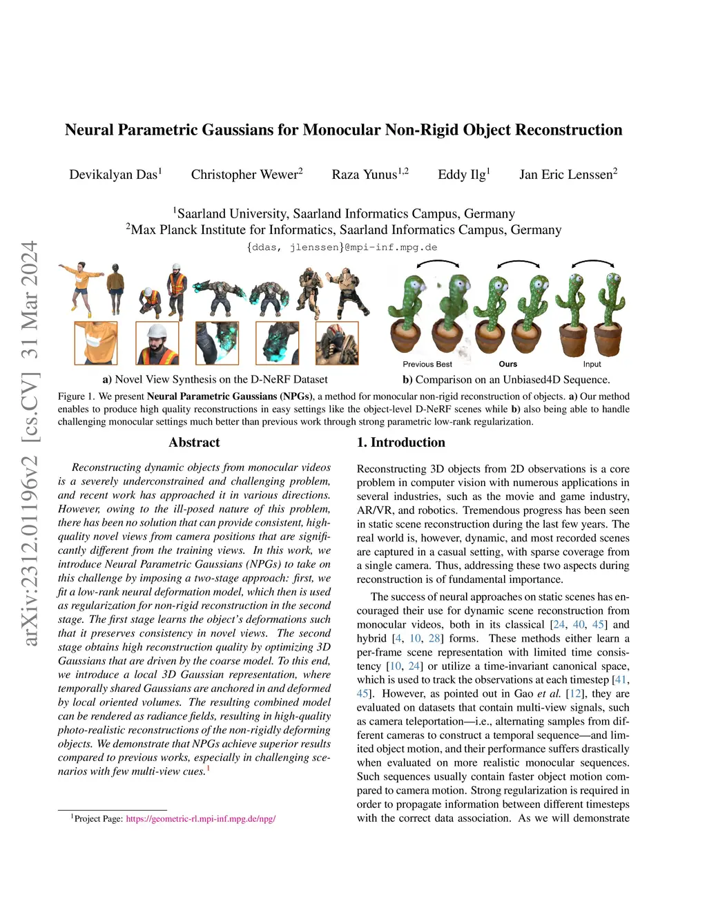 Neural Parametric Gaussians for Monocular Non-Rigid Object