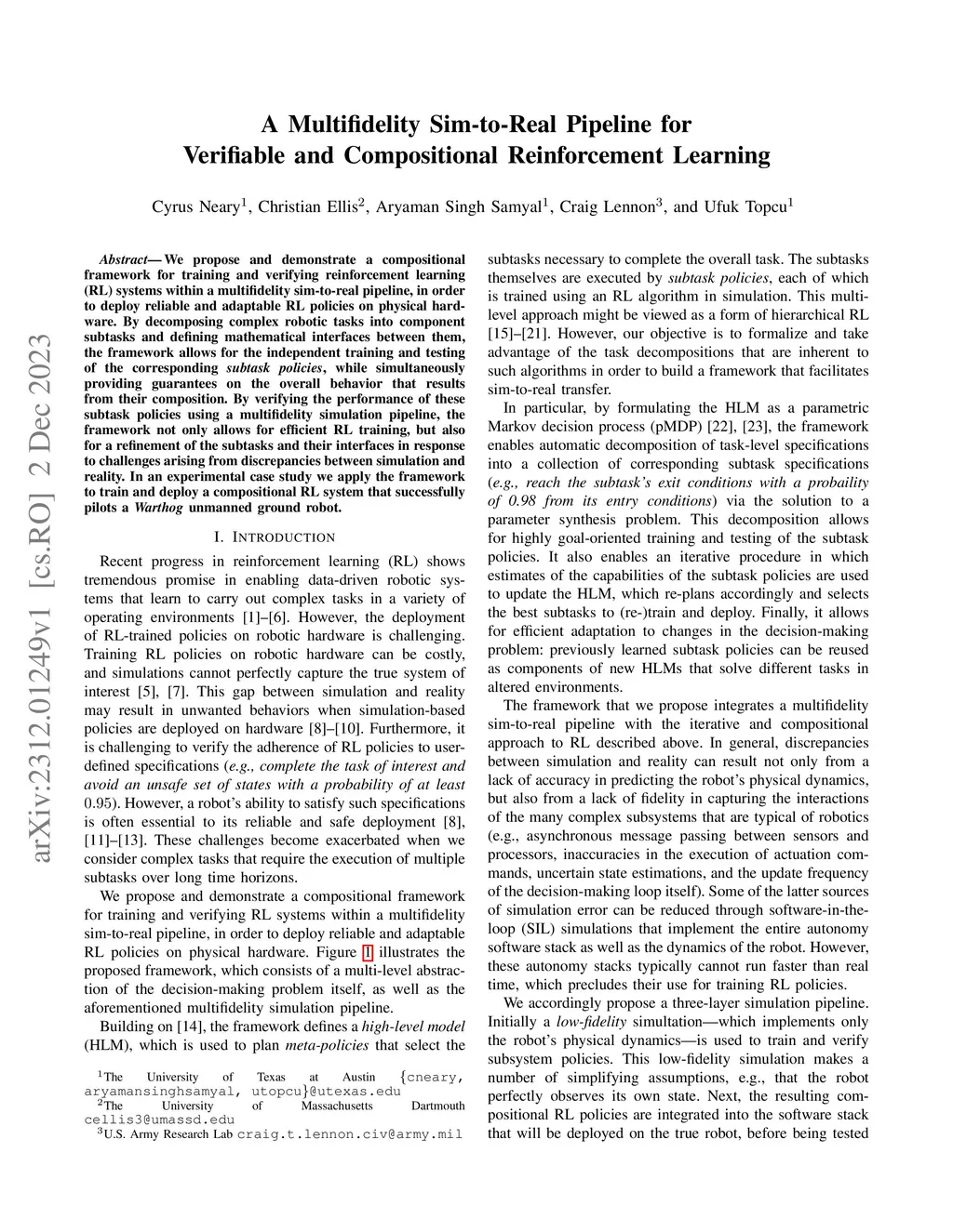 A Multifidelity Sim-to-Real Pipeline for Verifiable and Compositional