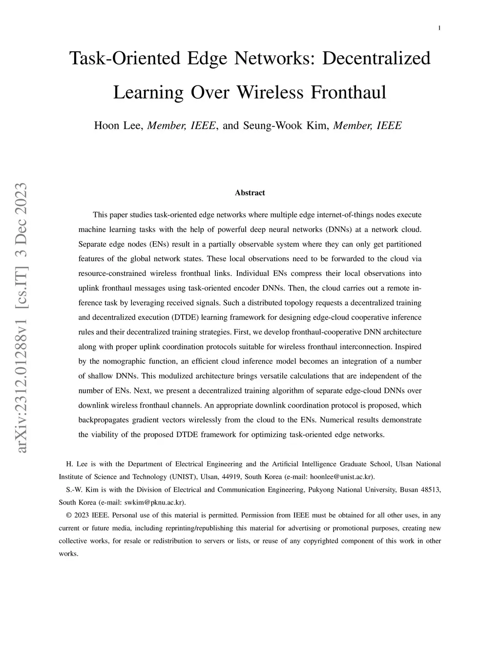 This paper studies task-oriented edge networks where multiple edge internet-of-things nodes execute machine learning tasks with the help of powerful deep neural networks (DNNs) at a network cloud. Separate edge nodes (ENs) result in a partially observable system where they can only get partitioned features of the global network states. These local observations need to be forwarded to the cloud via resource-constrained wireless fronthual links. Individual ENs compress their local observations into uplink fronthaul messages using task-oriented encoder DNNs. Then, the cloud carries out a remote inference task by leveraging received signals. Such a distributed topology requests a decentralized training and decentralized execution (DTDE) learning framework for designing edge-cloud cooperative inference rules and their decentralized training strategies. First, we develop fronthaul-cooperative DNN architecture along with proper uplink coordination protocols suitable for wireless fronthaul interconnection. Inspired by the nomographic function, an efficient cloud inference model becomes an integration of a number of shallow DNNs. This modulized architecture brings versatile calculations that are independent of the number of ENs. Next, we present a decentralized training algorithm of separate edge-cloud DNNs over downlink wireless fronthaul channels. An appropriate downlink coordination protocol is proposed, which backpropagates gradient vectors wirelessly from the cloud to the ENs.