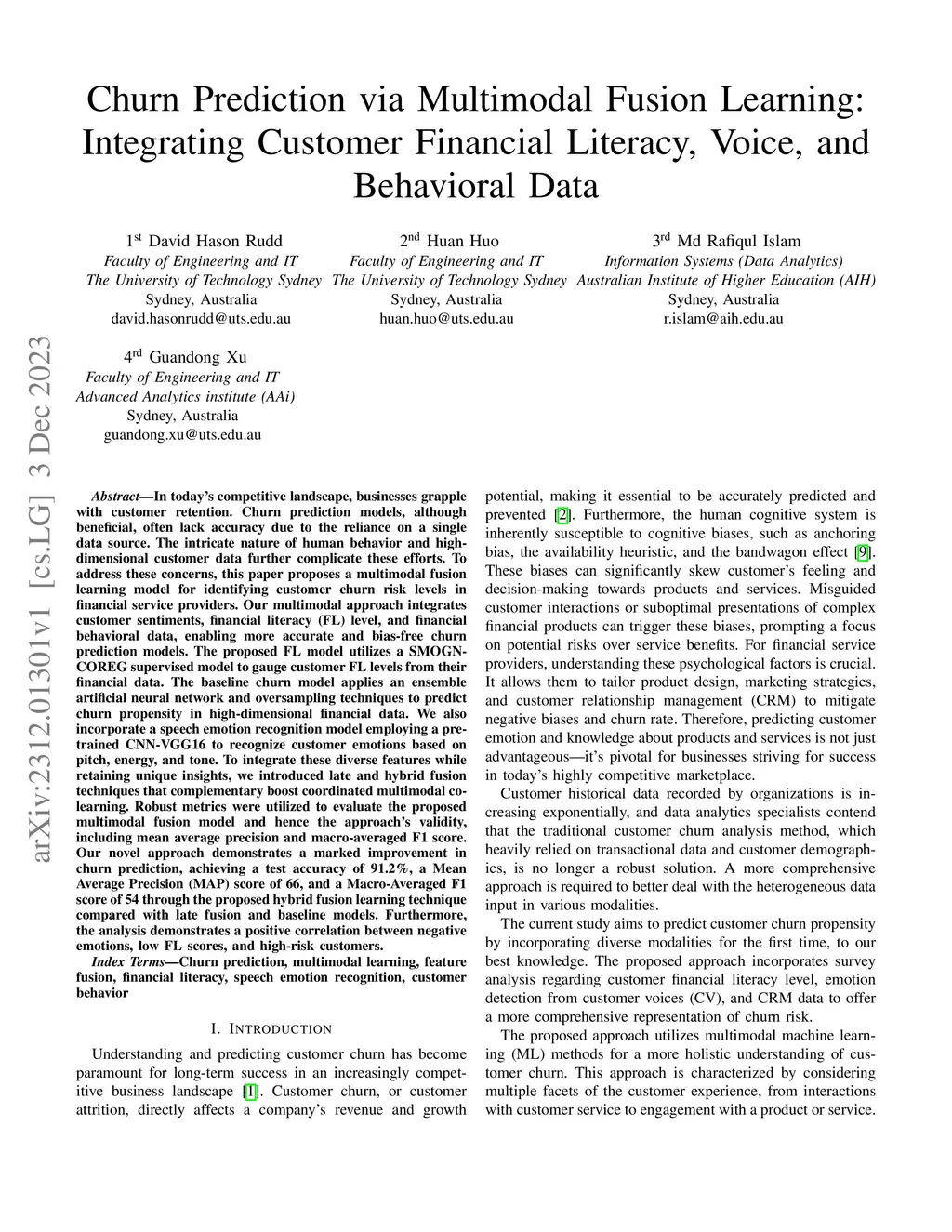 In todays competitive landscape, businesses grapple with customer retention. Churn prediction models, although beneficial, often lack accuracy due to the reliance on a single data source. The intricate nature of human behavior and high dimensional customer data further complicate these efforts. To address these concerns, this paper proposes a multimodal fusion learning model for identifying customer churn risk levels in financial service providers. Our multimodal approach integrates customer sentiments financial literacy (FL) level, and financial behavioral data, enabling more accurate and bias-free churn prediction models. The proposed FL model utilizes a SMOGN COREG supervised model to gauge customer FL levels from their financial data. The baseline churn model applies an ensemble artificial neural network and oversampling techniques to predict churn propensity in high-dimensional financial data. We also incorporate a speech emotion recognition model employing a pre-trained CNN-VGG16 to recognize customer emotions based on pitch, energy, and tone. To integrate these diverse features while retaining unique insights, we introduced late and hybrid fusion techniques that complementary boost coordinated multimodal co learning. Robust metrics were utilized to evaluate the proposed multimodal fusion model and hence the approach validity, including mean average precision and macro-averaged F1 score. Our novel approach demonstrates a marked improvement in churn prediction, achieving a test accuracy of 91.2%, a Mean Average Precision (MAP) score of 66, and a Macro-Averaged F1 score of 54 through the proposed hybrid fusion learning technique compared with late fusion and baseline models. Furthermore, the analysis demonstrates a positive correlation between negative emotions, low FL scores, and high-risk customers.
