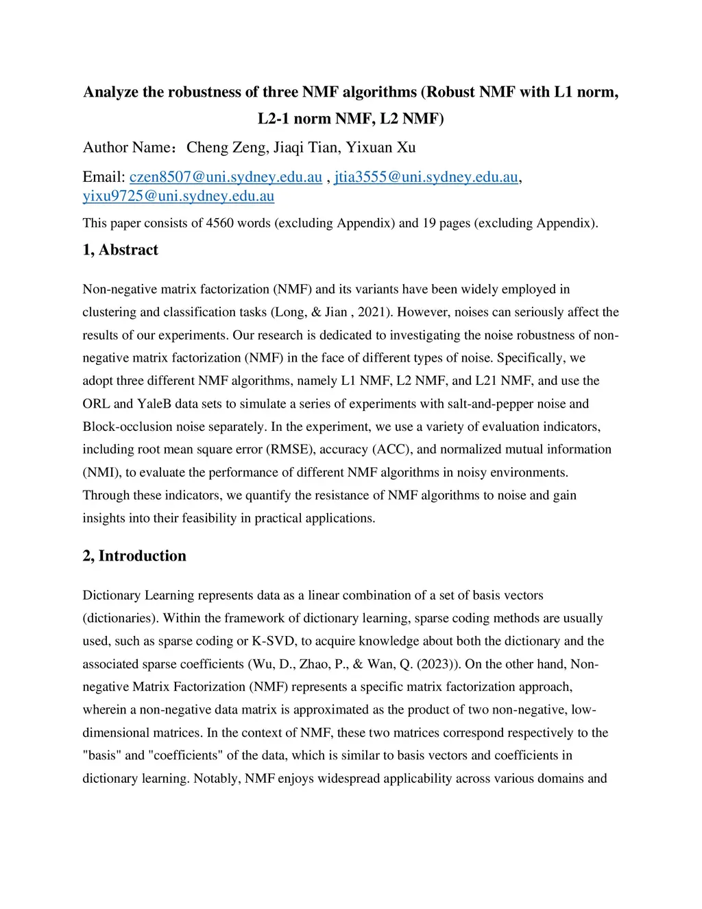 Analyze the robustness of three NMF algorithms (Robust NMF with L1 norm,