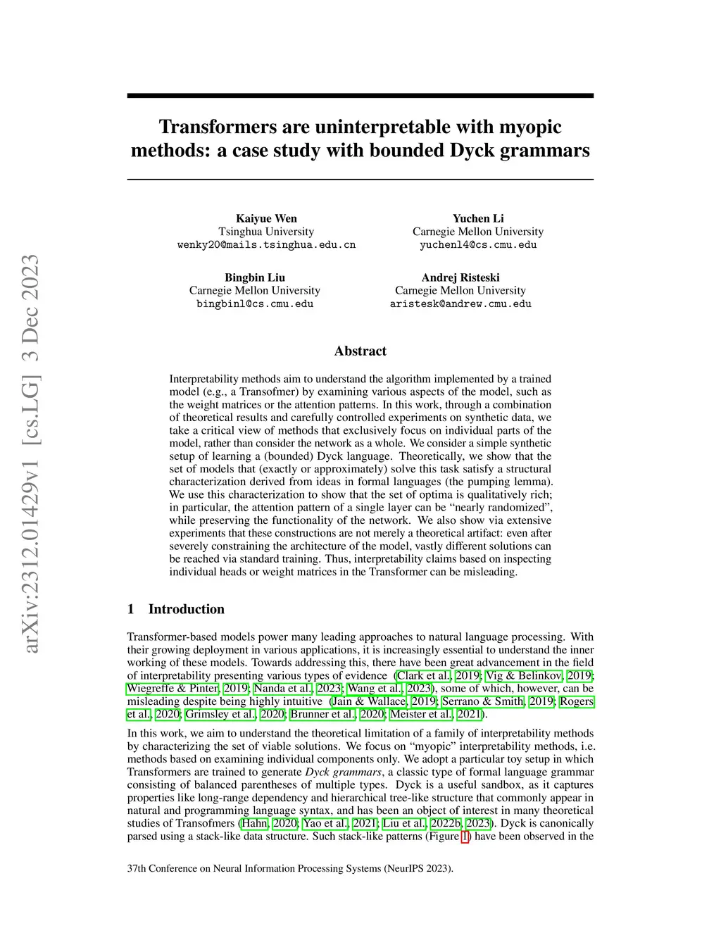 Interpretability methods aim to understand the algorithm implemented by a trained model (e.g., a Transofmer) by examining various aspects of the model, such as the weight matrices or the attention patterns. In this work, through a combination of theoretical results and carefully controlled experiments on synthetic data, we take a critical view of methods that exclusively focus on individual parts of the model, rather than consider the network as a whole. We consider a simple synthetic setup of learning a (bounded) Dyck language. Theoretically, we show that the set of models that (exactly or approximately) solve this task satisfy a structural characterization derived from ideas in formal languages (the pumping lemma). We use this characterization to show that the set of optima is qualitatively rich; in particular, the attention pattern of a single layer can be ``nearly randomized'', while preserving the functionality of the network. We also show via extensive experiments that these constructions are not merely a theoretical artifact: even after severely constraining the architecture of the model, vastly different solutions can be reached via standard training. Thus, interpretability claims based on inspecting individual heads or weight matrices in the Transformer can be misleading.