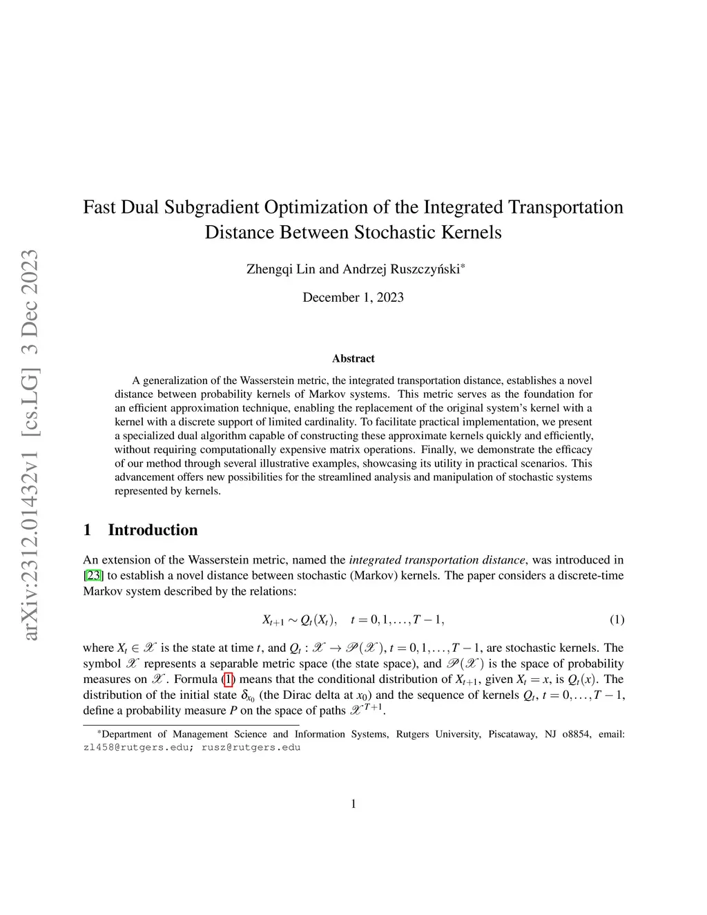 A generalization of the Wasserstein metric, the integrated transportation distance, establishes a novel distance between probability kernels of Markov systems. This metric serves as the foundation for an efficient approximation technique, enabling the replacement of the original system's kernel with a kernel with a discrete support of limited cardinality. To facilitate practical implementation, we present a specialized dual algorithm capable of constructing these approximate kernels quickly and efficiently, without requiring computationally expensive matrix operations. Finally, we demonstrate the efficacy of our method through several illustrative examples, showcasing its utility in practical scenarios. This advancement offers new possibilities for the streamlined analysis and manipulation of stochastic systems represented by kernels.