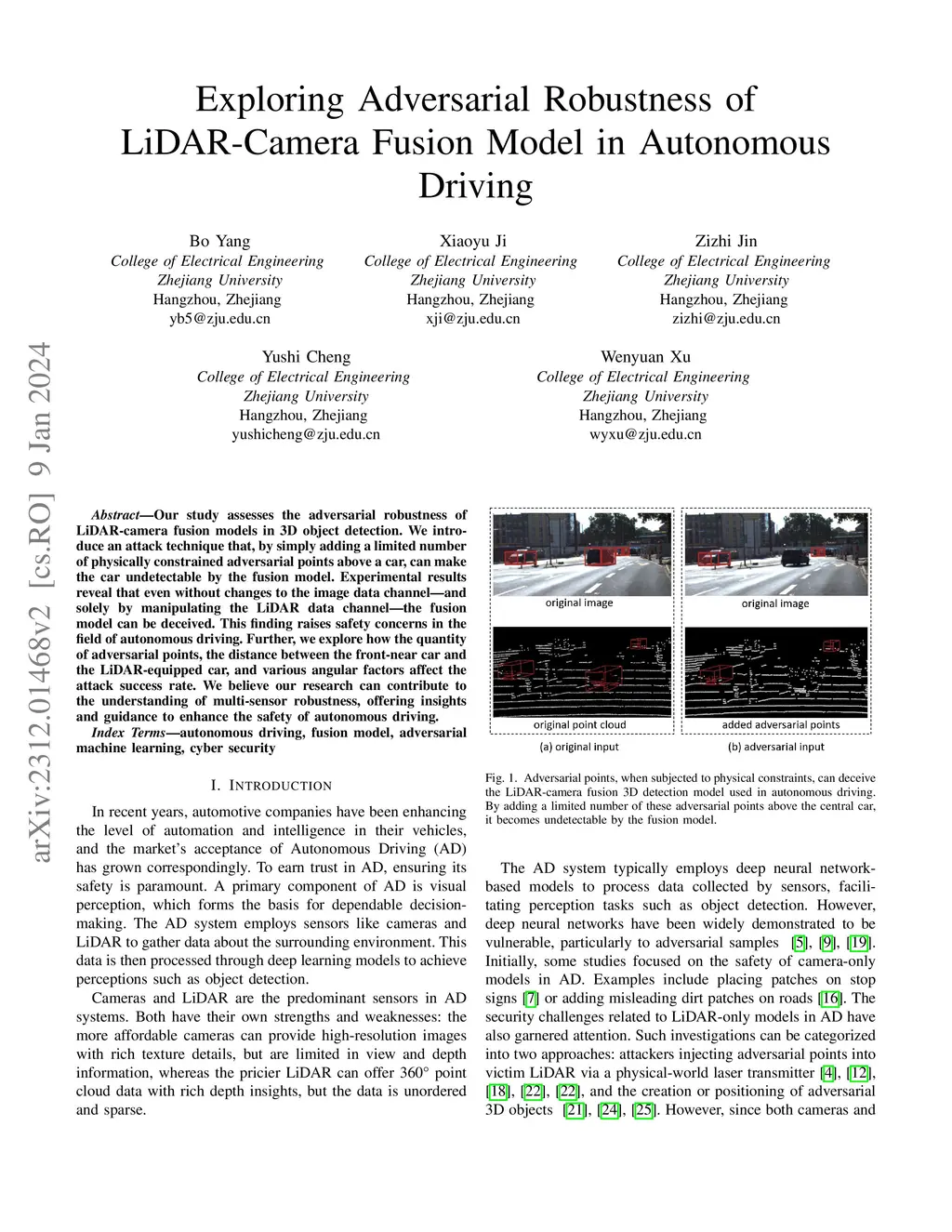 Our study assesses the adversarial robustness of LiDAR-camera fusion models in 3D object detection. We introduce an attack technique that, by simply adding a limited number of physically constrained adversarial points above a car, can make the car undetectable by the fusion model. Experimental results reveal that even without changes to the image data channel, the fusion model can be deceived solely by manipulating the LiDAR data channel. This finding raises safety concerns in the field of autonomous driving. Further, we explore how the quantity of adversarial points, the distance between the front-near car and the LiDAR-equipped car, and various angular factors affect the attack success rate. We believe our research can contribute to the understanding of multi-sensor robustness, offering insights and guidance to enhance the safety of autonomous driving.