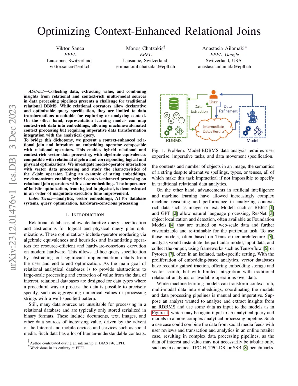 Collecting data, extracting value, and combining insights from relational and context-rich multi-modal sources in data processing pipelines presents a challenge for traditional relational DBMS. While relational operators allow declarative and optimizable query specification, they are limited to data transformations unsuitable for capturing or analyzing context. On the other hand, representation learning models can map context-rich data into embeddings, allowing machine-automated context processing but requiring imperative data transformation integration with the analytical query. To bridge this dichotomy, we present a context-enhanced relational join and introduce an embedding operator composable with relational operators. This enables hybrid relational and context-rich vector data processing, with algebraic equivalences compatible with relational algebra and corresponding logical and physical optimizations. We investigate model-operator interaction with vector data processing and study the characteristics of the E-join operator. Using an example of string embeddings, we demonstrate enabling hybrid context-enhanced processing on relational join operators with vector embeddings. The importance of holistic optimization, from logical to physical, is demonstrated in an order of magnitude execution time improvement.