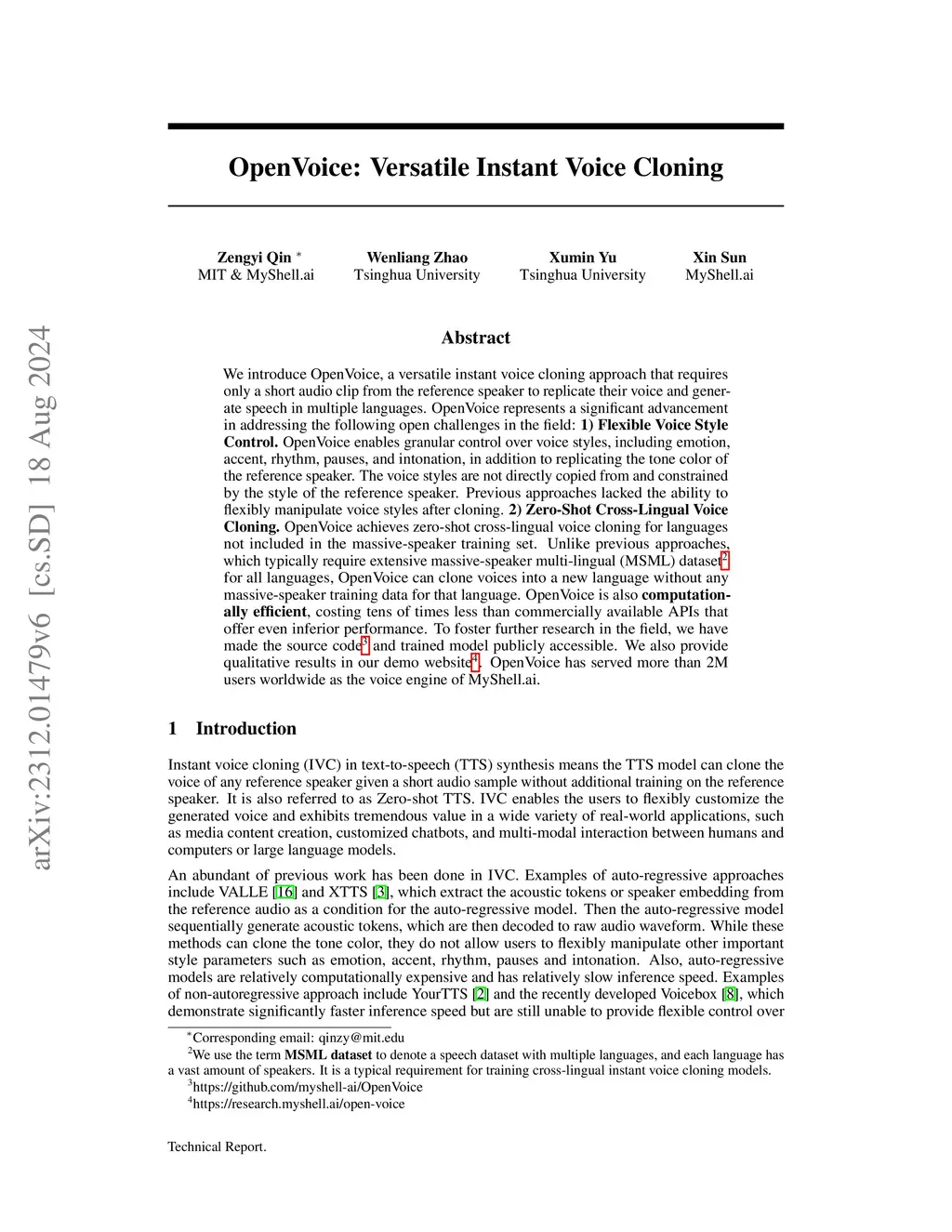 We introduce OpenVoice, a versatile voice cloning approach that requires only a short audio clip from the reference speaker to replicate their voice and generate speech in multiple languages. OpenVoice represents a significant advancement in addressing the following open challenges in the field: 1) Flexible Voice Style Control. OpenVoice enables granular control over voice styles, including emotion, accent, rhythm, pauses, and intonation, in addition to replicating the tone color of the reference speaker. The voice styles are not directly copied from and constrained by the style of the reference speaker. Previous approaches lacked the ability to flexibly manipulate voice styles after cloning. 2) Zero-Shot Cross-Lingual Voice Cloning. OpenVoice achieves zero-shot cross-lingual voice cloning for languages not included in the massive-speaker training set. Unlike previous approaches, which typically require extensive massive-speaker multi-lingual (MSML) dataset for all languages, OpenVoice can clone voices into a new language without any massive-speaker training data for that language. OpenVoice is also computationally efficient, costing tens of times less than commercially available APIs that offer even inferior performance. To foster further research in the field, we have made the source code and trained model publicly accessible. We also provide qualitative results in our demo website. Prior to its public release, our internal version of OpenVoice was used tens of millions of times by users worldwide between May and October 2023, serving as the backend of MyShell.