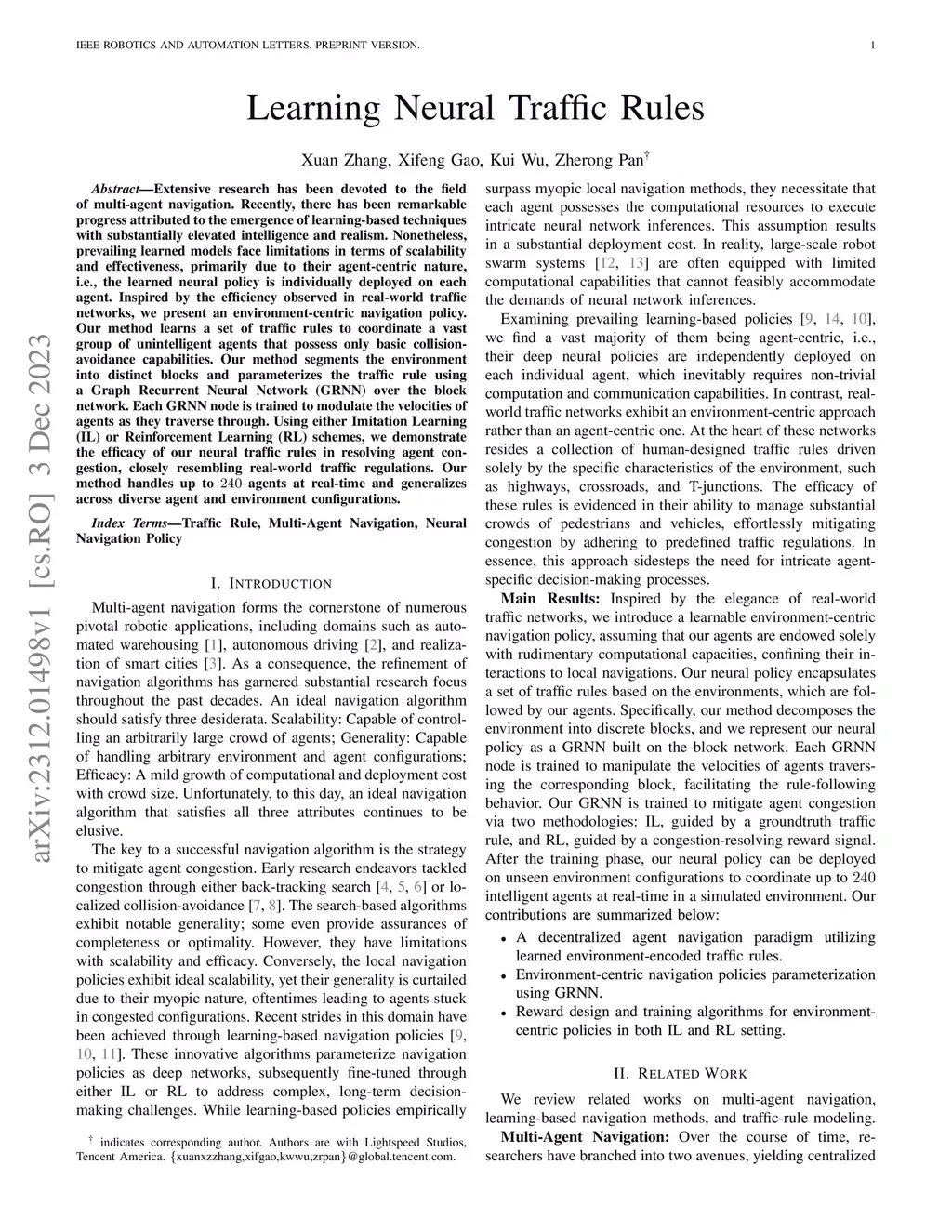Extensive research has been devoted to the field of multi-agent navigation. Recently, there has been remarkable progress attributed to the emergence of learning-based techniques with substantially elevated intelligence and realism. Nonetheless, prevailing learned models face limitations in terms of scalability and effectiveness, primarily due to their agent-centric nature, i.e., the learned neural policy is individually deployed on each agent. Inspired by the efficiency observed in real-world traffic networks, we present an environment-centric navigation policy. Our method learns a set of traffic rules to coordinate a vast group of unintelligent agents that possess only basic collision-avoidance capabilities. Our method segments the environment into distinct blocks and parameterizes the traffic rule using a Graph Recurrent Neural Network (GRNN) over the block network. Each GRNN node is trained to modulate the velocities of agents as they traverse through. Using either Imitation Learning (IL) or Reinforcement Learning (RL) schemes, we demonstrate the efficacy of our neural traffic rules in resolving agent congestion, closely resembling real-world traffic regulations. Our method handles up to agents at real-time and generalizes across diverse agent and environment configurations.