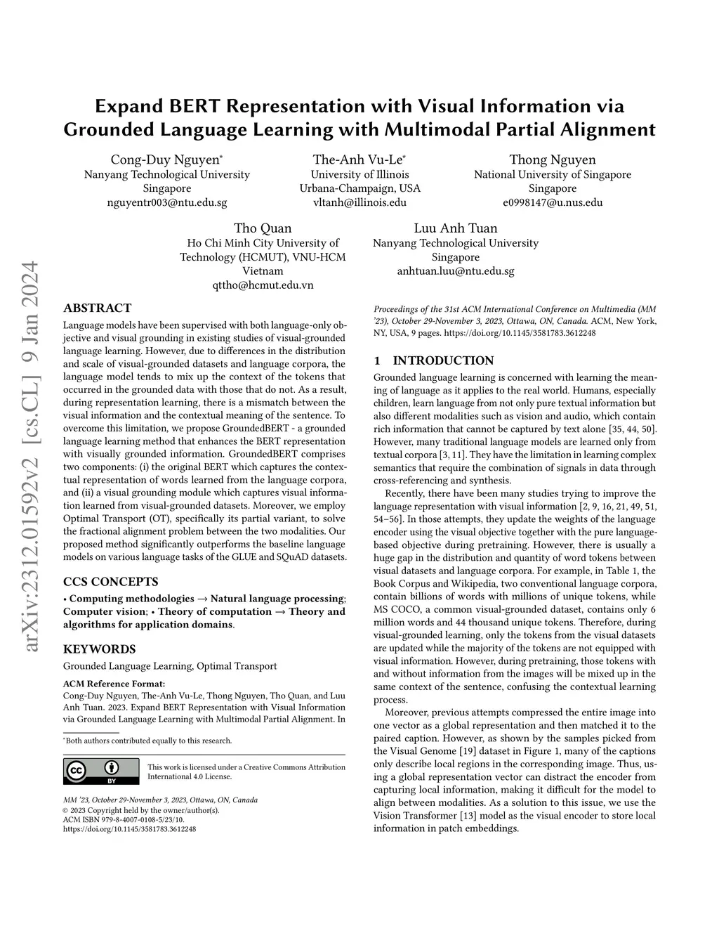 Language models have been supervised with both language-only objective and visual grounding in existing studies of visual-grounded language learning. However, due to differences in the distribution and scale of visual-grounded datasets and language corpora, the language model tends to mix up the context of the tokens that occurred in the grounded data with those that do not. As a result, during representation learning, there is a mismatch between the visual information and the contextual meaning of the sentence. To overcome this limitation, we propose GroundedBERT - a grounded language learning method that enhances the BERT representation with visually grounded information. GroundedBERT comprises two components: (i) the original BERT which captures the contextual representation of words learned from the language corpora, and (ii) a visual grounding module which captures visual information learned from visual-grounded datasets. Moreover, we employ Optimal Transport (OT), specifically its partial variant, to solve the fractional alignment problem between the two modalities. Our proposed method significantly outperforms the baseline language models on various language tasks of the GLUE and SQuAD datasets.