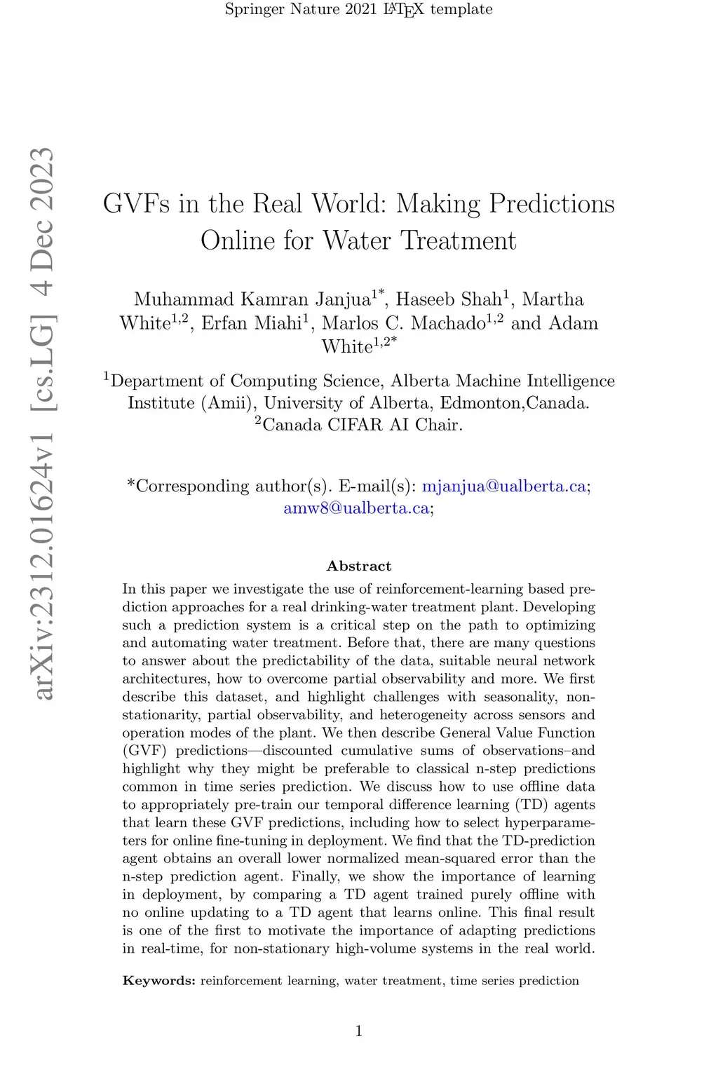 In this paper we investigate the use of reinforcement-learning based prediction approaches for a real drinking-water treatment plant. Developing such a prediction system is a critical step on the path to optimizing and automating water treatment. Before that, there are many questions to answer about the predictability of the data, suitable neural network architectures, how to overcome partial observability and more. We first describe this dataset, and highlight challenges with seasonality, nonstationarity, partial observability, and heterogeneity across sensors and operation modes of the plant. We then describe General Value Function (GVF) predictions -- discounted cumulative sums of observations -- and highlight why they might be preferable to classical n-step predictions common in time series prediction. We discuss how to use offline data to appropriately pre-train our temporal difference learning (TD) agents that learn these GVF predictions, including how to select hyperparameters for online fine-tuning in deployment. We find that the TD-prediction agent obtains an overall lower normalized mean-squared error than the n-step prediction agent. Finally, we show the importance of learning in deployment, by comparing a TD agent trained purely offline with no online updating to a TD agent that learns online. This final result is one of the first to motivate the importance of adapting predictions in real-time, for non-stationary high-volume systems in the real world.