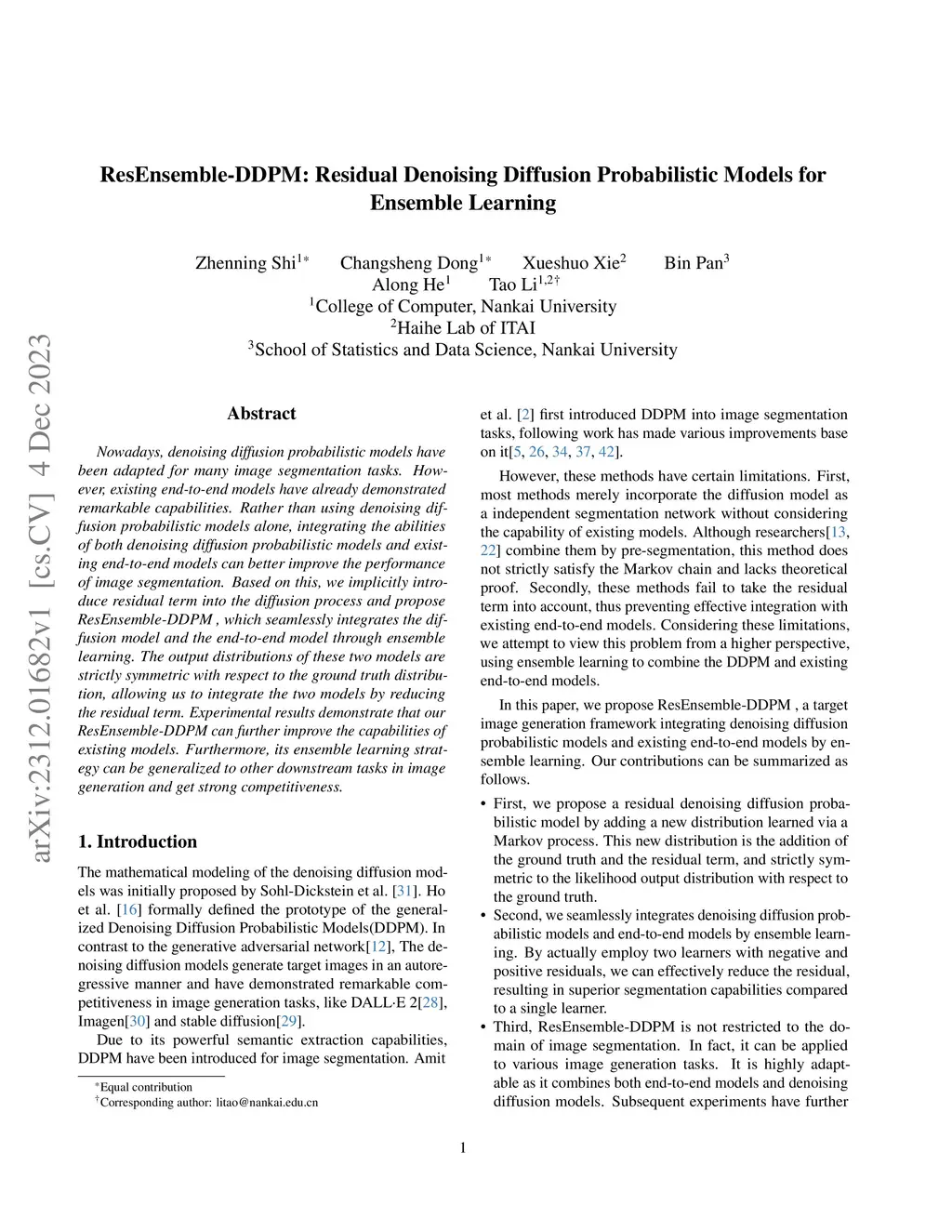 Nowadays, denoising diffusion probabilistic models have been adapted for many image segmentation tasks. However, existing end-to-end models have already demonstrated remarkable capabilities. Rather than using denoising diffusion probabilistic models alone, integrating the abilities of both denoising diffusion probabilistic models and existing end-to-end models can better improve the performance of image segmentation. Based on this, we implicitly introduce residual term into the diffusion process and propose ResEnsemble-DDPM, which seamlessly integrates the diffusion model and the end-to-end model through ensemble learning. The output distributions of these two models are strictly symmetric with respect to the ground truth distribution, allowing us to integrate the two models by reducing the residual term. Experimental results demonstrate that our ResEnsemble-DDPM can further improve the capabilities of existing models. Furthermore, its ensemble learning strategy can be generalized to other downstream tasks in image generation and get strong competitiveness.