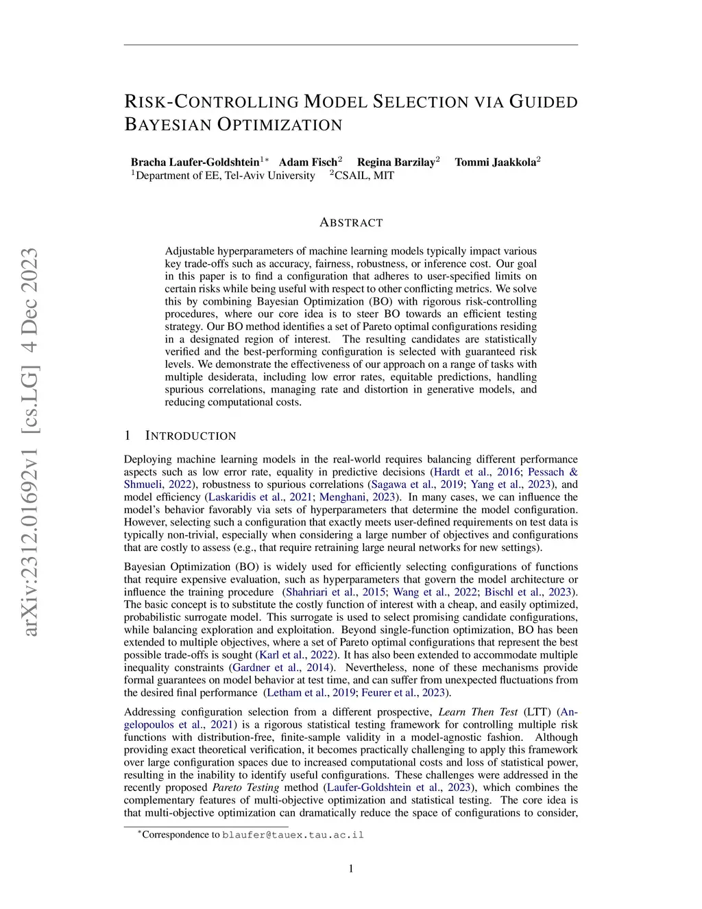 Adjustable hyperparameters of machine learning models typically impact various key trade-offs such as accuracy, fairness, robustness, or inference cost. Our goal in this paper is to find a configuration that adheres to user-specified limits on certain risks while being useful with respect to other conflicting metrics. We solve this by combining Bayesian Optimization (BO) with rigorous risk-controlling procedures, where our core idea is to steer BO towards an efficient testing strategy. Our BO method identifies a set of Pareto optimal configurations residing in a designated region of interest. The resulting candidates are statistically verified and the best-performing configuration is selected with guaranteed risk levels. We demonstrate the effectiveness of our approach on a range of tasks with multiple desiderata, including low error rates, equitable predictions, handling spurious correlations, managing rate and distortion in generative models, and reducing computational costs.