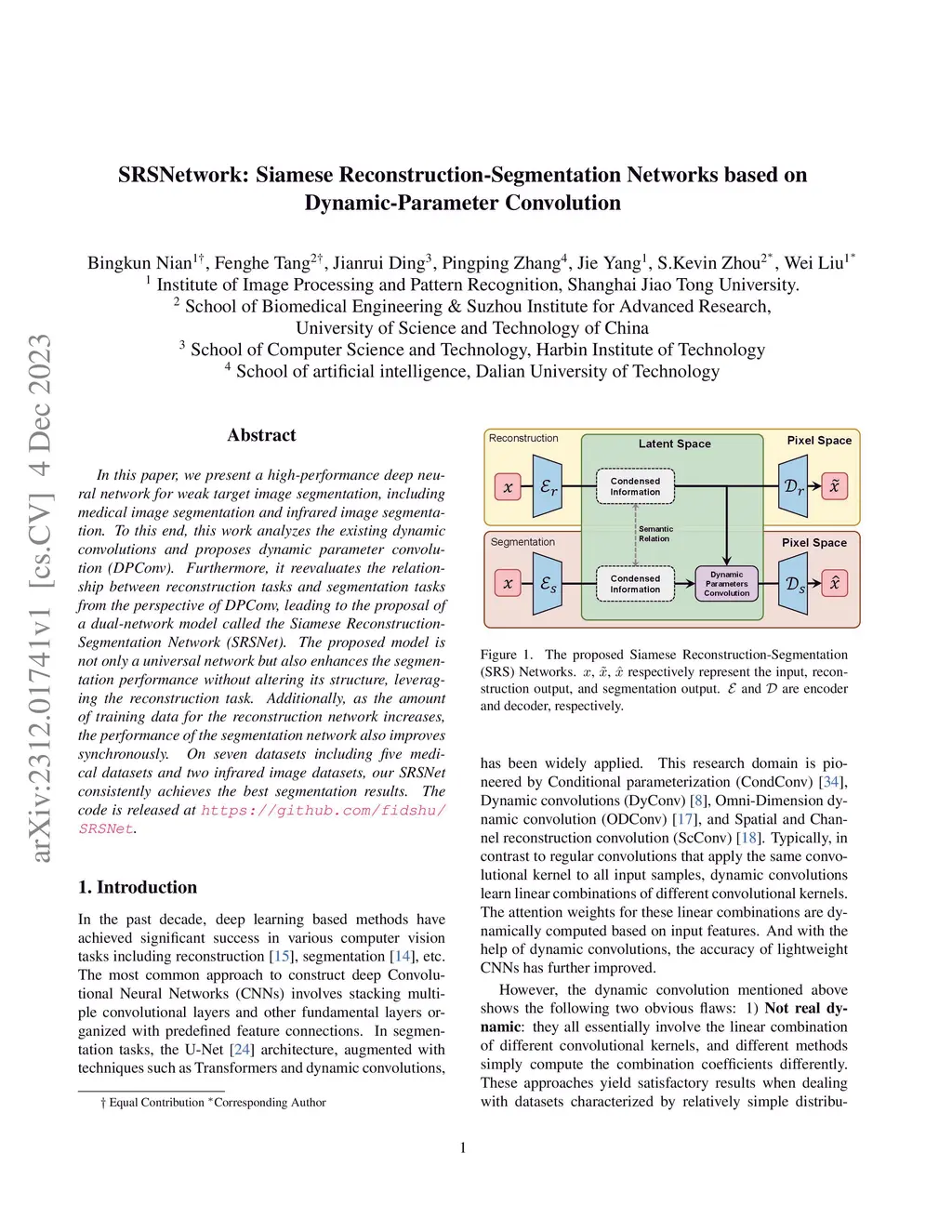 SRSNetwork: Siamese Reconstruction-Segmentation Networks based on Dynamic-Parameter Convolution