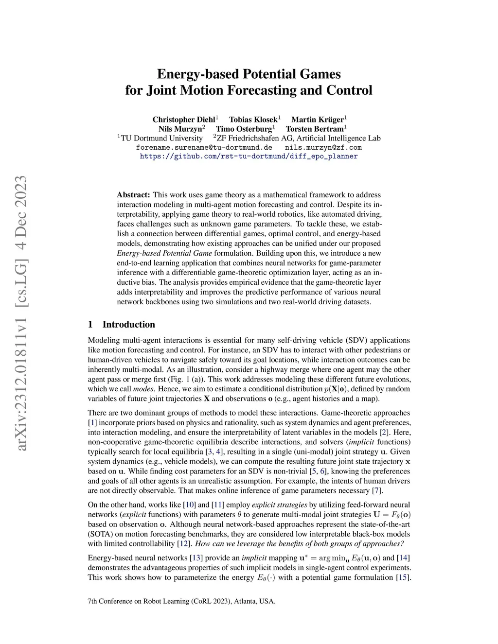 This work uses game theory as a mathematical framework to address interaction modeling in multi-agent motion forecasting and control. Despite its interpretability, applying game theory to real-world robotics, like automated driving, faces challenges such as unknown game parameters. To tackle these, we establish a connection between differential games, optimal control, and energy-based models, demonstrating how existing approaches can be unified under our proposed Energy-based Potential Game formulation. Building upon this, we introduce a new end-to-end learning application that combines neural networks for game-parameter inference with a differentiable game-theoretic optimization layer, acting as an inductive bias. The analysis provides empirical evidence that the game-theoretic layer adds interpretability and improves the predictive performance of various neural network backbones using two simulations and two real-world driving datasets.