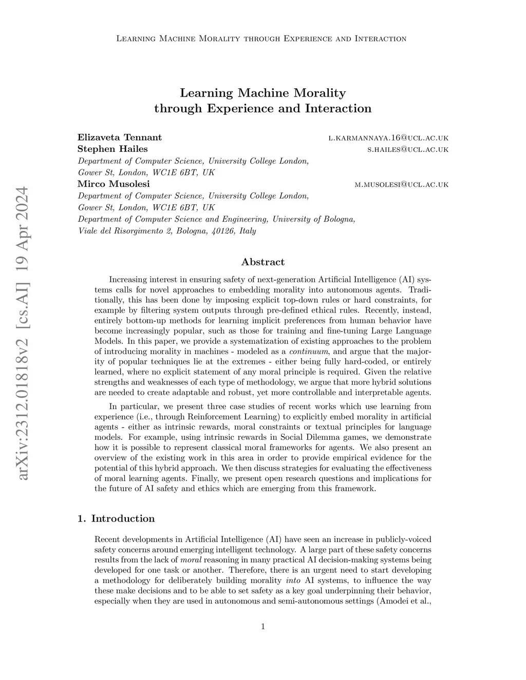 Increasing interest in ensuring the safety of next-generation Artificial Intelligence (AI) systems calls for novel approaches to embedding morality into autonomous agents. This goal differs qualitatively from traditional task-specific AI methodologies. In this paper, we provide a systematization of existing approaches to the problem of introducing morality in machines - modelled as a continuum. Our analysis suggests that popular techniques lie at the extremes of this continuum - either being fully hard-coded into top-down, explicit rules, or entirely learned in a bottom-up, implicit fashion with no direct statement of any moral principle (this includes learning from human feedback, as applied to the training and finetuning of large language models, or LLMs). Given the relative strengths and weaknesses of each type of methodology, we argue that more hybrid solutions are needed to create adaptable and robust, yet controllable and interpretable agentic systems. To that end, this paper discusses both the ethical foundations (including deontology, consequentialism and virtue ethics) and implementations of morally aligned AI systems.We present a series of case studies that rely on intrinsic rewards, moral constraints or textual instructions, applied to either pure-Reinforcement Learning or LLM-based agents. By analysing these diverse implementations under one framework, we compare their relative strengths and shortcomings in developing morally aligned AI systems. We then discuss strategies for evaluating the effectiveness of moral learning agents. Finally, we present open research questions and implications for the future of AI safety and ethics which are emerging from this hybrid framework.